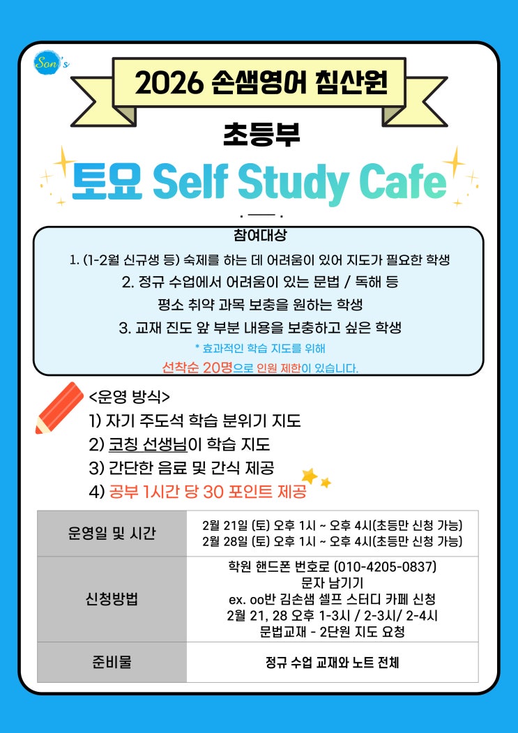 [손샘영어침산원_초등관] 2월 토요 Self Study Cafe 일정 안내