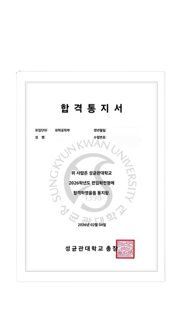 안녕하세요. 이번에 부평캠퍼스에서 수강하여 성균관대학교 화학공학부에 최종합격한 우OO입니다. 저는 부평캠퍼스에서 1월부터 수강하였고 서강대, 성균관대, 경희대, 홍익대, 국민대, 숭실대, 아주대, 광운대, 항공대, 가천대에 최종 합격하였습니다. 일단 제가 편입을 해보고 말씀드리고 싶은 점은 자연계라고 해도 '절대로 영어를 포기하면 안된다.' 입니다. 많은 자연계 학생 분들이 나중에는 영어를 아예 포기하거나 아니면 애초에 시작도 안 하시는 분들이 많습니다. 제 경험상 이건 결코 도움이 되지 않습니다. 여전히 많은 학교들이 편입 영어를 보고 있고 편입 수학만 보는 학교들을 지원하기 위해서는 편입 수학을 보통 잘....... <img src="https://blogthumb.pstatic.net/MjAyNjAyMjZfMTA5/MDAxNzcyMDY2OTk2OTAw.ZA3kfyu8mQBT_c0OViYxgN3NXasGxdk4ukM42spD2YIg.FZdRjouZaXU-WFG8U0CGQRW30h9LBFTHe-zINncqupsg.PNG/%BC%BA%B1%D5%B0%FC%B4%EB_%BF%EC%C1%D6%C7%F5-removebg-preview.png?type=s3" />