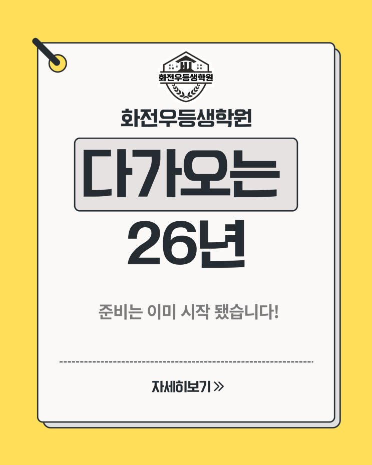 안녕하세요, 화전 우등생학원입니다. 시험 준비로 분주한 한 달을 보내며 선생님들과 학생들이 하나가 되어 열심히 시험을 준비했고, 지금은 좋은 결과로 마무리가 되어가고 있습니다. 잠깐의 휴식 후, 학원에서는 바로 각 과목 선생님들과 다음 학년 회의를 진행하고 있습니다. 또한 각 학생들의 반별 수준에 맞는 교재를 선정하며 내년을 위한 준비도 차근차근 하고 있습니다. 공부는 늘 해도 해도 시간이 모자라는 것 같습니다. 12월에는 방학도 있고 연휴도 있어 수업할 수 있는 요일이 제한적이지만, 그 안에서도 최선을 다해 우리 아이들과 알차게 공부하겠습니다. 12월, 1월, 2월을 충실히 보내어 더 성장해 있을 내년 2026년이 기대됩니....... <img src="https://blogthumb.pstatic.net/MjAyNTEyMTFfNjMg/MDAxNzY1NDM3NjM2OTAz.0dZdvoavdhwmkCi6K4mZp_CuXjDvg-biJuHHEeVD03kg.LBHD3O4ffddN4pW8vQxwXH_NwDZs0xdwPbN7VBts60Ig.PNG/1.png?type=s3" />
