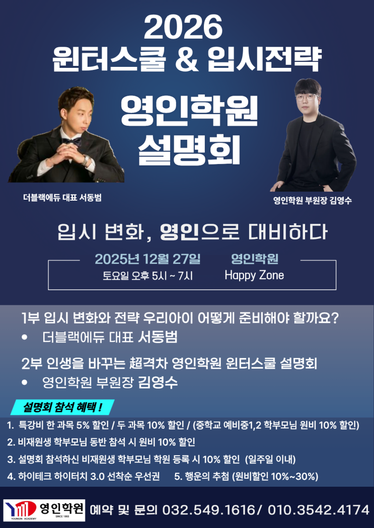 안녕하세요 사랑으로 가르치고 믿음으로 배우는 영인학원입니다. 새로운 학년을 맞이하기 전 겨울방학은 정말 중요한 시기입니다. 따라서 영인학원에서는 변화하는 입시 변화와 전략에 따른 우리 아이가 공부해야 하는 방법과 영인학원 윈터스쿨 프로그램에 대해 더블랙에듀 서동범 대표님과 영인학원 김영수 부원장님이 설명회를 진행합니다. 설명회 포스터 설명회 장소 및 시간 12월 27일 토요일 오후 5시 ~ 7시 영인학원 2층에서 진행 (학부모님 대상) 12월 22일 ~ 23일 영인학원 2층 Happy Zone에서 진행 (학생 대상) 설명회 순서 1부 입시 변화와 전략 우리 아이 어떻게 준비해야 할까요? - 더블랙에듀 대표 서동범 2부 인생을 바꾸는 超격....... <img src="https://blogthumb.pstatic.net/MjAyNTEyMTRfMjUw/MDAxNzY1NzE0NDEwMzcw.8isbp-bsjO6A_aKSlwNS2jch_j4vsh6tqWkz-lvsTLwg.rW6shwBEXbK9gaWZjllrRspqdPU85CCu00nTAJtNEn0g.PNG/%C1%A6%B8%F1%C0%BB_%C0%D4%B7%C2%C7%D8%C1%D6%BC%BC%BF%E4_%288%29.png?type=s3" />