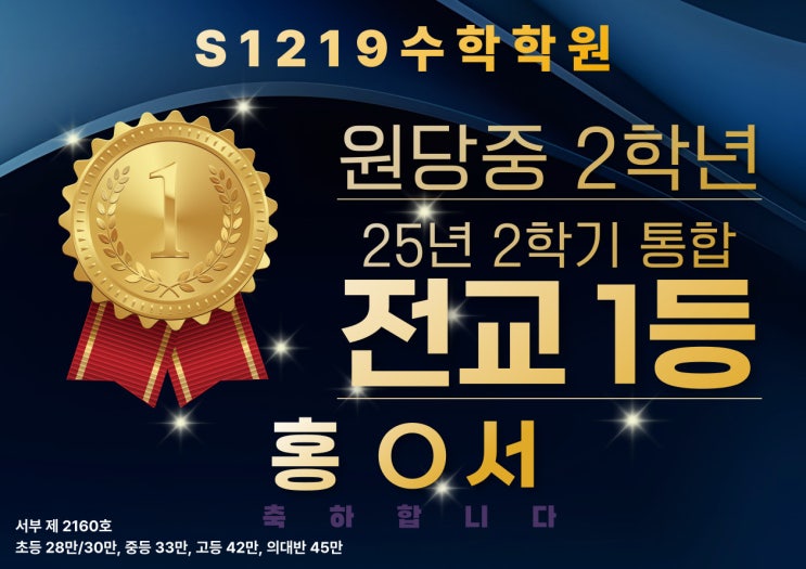 안녕하세요 S1219수학학원 입니다. 우리 학원의 자랑스러운 학생이 1학기 통합에 이어 2학기 통합에서도 전교 1등을 달성했습니다! 두 번의 통합 전교 1등을 이루어낸 이 놀라운 성과에 진심으로 축하의 마음을 전하고 싶습니다. 그동안 이 학생은 학업에 대한 끊임없는 열정과 노력으로 한 걸음 한 걸음 자신만의 길을 만들어왔습니다. 하루하루 치열하게 공부하면서도 포기하지 않고 끝까지 최선을 다한 모습이 이번 결과로 이어졌다고 생각합니다. 한 해 동안 쏟아낸 땀과 시간을 생각하면, 그 모든 노력이 이렇게 빛을 발하는 순간이 정말 대단하게 느껴집니다. 올 한 해 동안 겪었을 모든 고난과 시련, 때로는 힘들었던 순간들이 분명 있었....... <img src="https://blogthumb.pstatic.net/MjAyNTEyMzFfMTk4/MDAxNzY3MTc3MTUyMDcx.ClEOrCWneKhmPun90EoITSPV9y4fs2Zmt0kHxMFFSwAg.SSKQJX8-cXjPcwtc5S_Cik8EUzTZiJLFIBRgCo1LWisg.JPEG/%C1%A6%B8%F1%C0%BB-%C0%D4%B7%C2%C7%D8%C1%D6%BC%BC%BF%E4_-009.jpg?type=s3" />