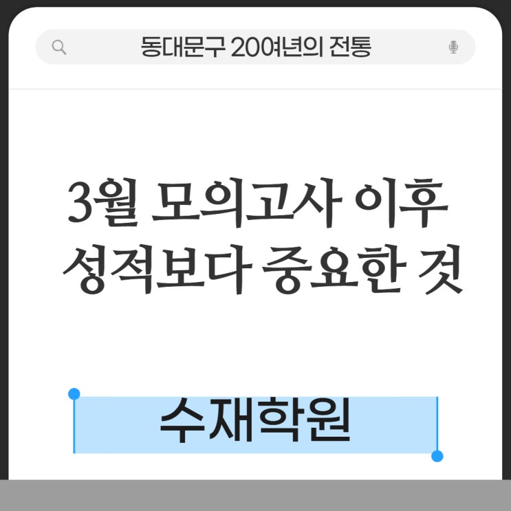 안녕하세요? 동대문구 20여년의 전통 수재학원입니다. 3월 모의고사를 보고 나면 학생도, 학부모님도 한 번씩 멈칫하게 됩니다. “이 점수 맞는 건가?” “지금부터 문제집 돌려야 하나?” 그런데 여기서 방향을 잘못 잡으면 생각보다 길게 돌아가게 됩니다. 조금 냉정하게 보면, 이번 시험은 “지금 실력”이 아니라 지금까지 쌓아온 공부의 결과입니다. 학기 중 공부 방향 완전 정리 1. 이번 모의고사 점수, 사실 어디서 나온 걸까 3월 모의고사는 고1 기준으로 보면 중학교 때 공부, 고2·고3 기준으로 보면 이전 학년 공부가 그대로 반영됩니다. 즉, 이번 점수는 “지금 공부를 잘했냐”가 아니라 이미 만들어진 실력의 결과입니다. 그래서 점....... <img src="https://blogthumb.pstatic.net/MjAyNjA0MDNfMjMx/MDAxNzc1MjAyNjQ1MTk3.fjJUnbWsBRTOmmBUVDsAu9gZMbzGRikJejD2kOZPfa8g.ZYamOC6Bl6-EQ2CwOEpBoAi_KqCMaEkX70F5lDNyX-og.JPEG/%C1%A6%B8%F1%C0%BB_%C0%D4%B7%C2%C7%CF%BC%BC%BF%E4_%289%29.jpg?type=s3" />