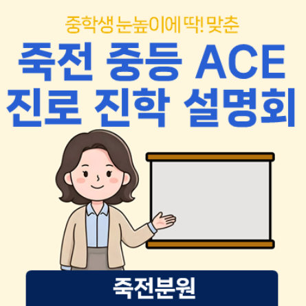ACE 프로그램과 함께하는 자기주도 학습 방향 설정 안녕하세요 정상어학원 죽전분원입니다! 중학생 시기는 단순히 영어 실력 향상뿐만 아니라, “앞으로 어떤 방향으로 나아가야 할지”를 고민하는 매우 중요한 시기인데요. 하지만 많은 학생들이 학습 동기를 잃거나 방향을 잡지 못해 어려움을 겪는 시기이기도 합니다. 그래서 저희 정상어학원에서는 학생들의 성장을 위해 단순한 영어 교육을 넘어, 진로 설계까지 함께하는 특별한 시간을 준비했습니다! 중등 대상 ‘진로 진학 설명회’ 진로 진학 설명회 일정: 2026.03.18(수)~03.19(목) 강연자: 김선문 선임연구원 (정상어학원 특목고반 & 입시 컨설팅 전문가) 중....... <img src="https://blogthumb.pstatic.net/MjAyNjA0MDRfMjcw/MDAxNzc1MzA4NDMwNzM4.l3G2HwLjVTH-TiiET0b9yYByz51-pLHe5j20BiVDO0Mg.7n7hjpx3biFTCrfUgpFQOWQCLuQVAEWDsIurLjcvYfwg.PNG/%BD%BA%C5%A9%B8%B0%BC%A6_2026-04-04_221343.png?type=s3" />