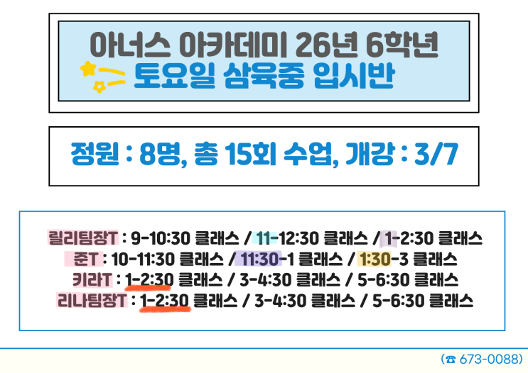 아너스 아카데미 26년 6학년 토요일 삼육중 입시반 안내 (키라T, 준T)