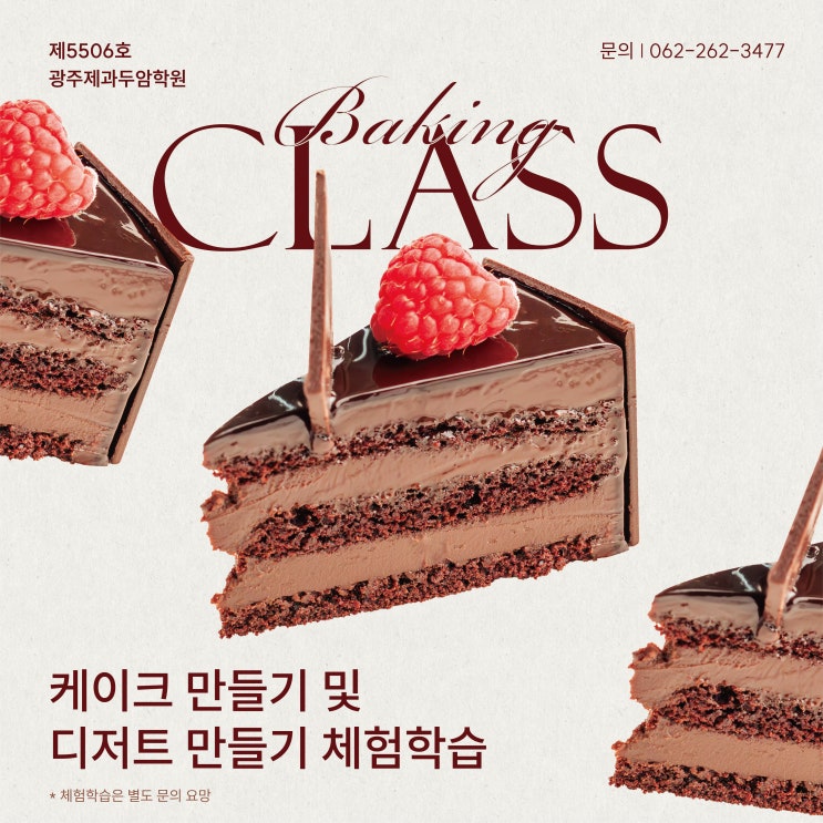 안녕하세요 광주제과두암학원입니다 :) 살랑한 봄바람이 불어오는 요즘, 왠지 모르게 달콤한 디저트가 생각나는 순간들 직접 케이크와 다양한 디저트를 만들어보며 봄처럼 달콤한 시간을 보내보세요. BAKING CLASS 케이크 만들기 및 디저트 만들기 원데이 클래스 체험학습 수업내용 특별한 날 선물하기 좋은 레터링 케이크 만들기, 기본적인 크림류 케이크(딸기생크림,고구마,티라미수 등) 만들기, 휘낭시에, 갈레트 브루통, 버터쿠키, 마카롱 등 다양한 구움과자류 만들기 체험학습 품목 체험학습 비용 * 단 10인 기준 1인당 금액이나 10인 이외의 인원일 경우 금액 변동이 있을 수 있습니다. 문의사항 062-262-3477 *체....... <img src="https://blogthumb.pstatic.net/MjAyNjAzMThfMTAz/MDAxNzczODE0OTYwNzIw.VtjicipRCq36bpEg_OISkB-4nwRZiKeBjlqjhrq1rMog.EMD7yoWZMazzBbXnnfg6BiUMOwwus8k0XEdUIYizTX0g.JPEG/2026.03.17_%B5%CE%BE%CF%C7%D0%BF%F8_%BA%ED%B7%CE%B1%D7_4%B0%FA%C1%A4_%B4%EB%C1%F6_1_%BB%E7%BA%BB_8.jpg?type=s3" />