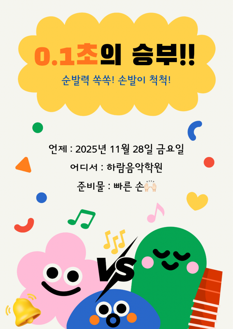 안녕하세요 하람음악학원입니다~~!! 벌써 한 해의 마지막 달인 12월이 성큼 다가왔습니다 이제 2025년의 하람특강도 한번 남았다니.. 날씨가 추워진만큼 다들 따뜻하게 입으시고 감기 조심하세요☺️ 이번 11월 예술융합특강은 다양한 순발력 게임들로 진행해보았는데요!! 적혀있는 준비물을 다들 잘 준비해왔을지 구경해보실까요~~~~? 첫번째 워밍업 게임 에그 쉐이커에 선생님들이 하나하나 이론문제들을 적어놓았습니다! 어느팀이 계란을 많이 완성시키나~~~~ 뜨거웠던 현장 느껴지시나요... 열심히 짝을 완성시켜주던 우리 불꽃 하람둥이들.. 계란판에 계란을 짝맞춰 올려주면 완성!! 다음 두번째 게임은~~~ 할리갈....... <img src="https://blogthumb.pstatic.net/MjAyNTExMjlfMjMx/MDAxNzY0Mzg2NTc3NDAw.tjoyt1B0h0beIoY4humaJHfHTYRrs-SKeZKRp1tNMtUg.cNDfgtwjV0_Egc4OxMu8Ads7xIer7CQpHP6ez7l1srog.PNG/900%A3%DF1764321933274.png?type=s3" />