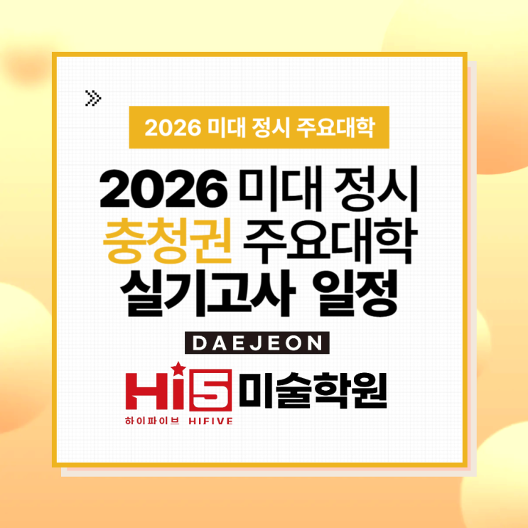 안녕하세요. 대전 하이파이브·애니 하이 미술 학원입니다! 지난 1탄과 2탄에서는 수도권과 경기권 주요 미대의 2026학년도 정시 실기 전형과 일정을 소개해 드렸는데요. 오늘은 그 3탄으로, 많은 수험생들이 관심을 갖고 있는 충청권 주요 미대의 2026학년도 정시 실기고사 일정 및 전형을 정리해 드리려고 합니다! 특히 충청권은 한 대학 안에 디자인 계열과 만화·애니메이션 관련 학과가 함께 개설된 경우가 많아 수험생 입장에서 선택의 폭이 넓은 지역이기도 한데요. 그만큼 학교별 실기 유형과 평가 방식에 확실한 차이가 있어 전략적인 준비가 매우 중요합니다. 다만 정시는 지원 상황에 따라 대학별 모집 인원, 실기 유형, 일정 등이 변경....... <img src="https://blogthumb.pstatic.net/MjAyNTEyMDVfMTg0/MDAxNzY0OTMxODIxMTI4.EKF3vXnFRem5iv24Vh9y365ScvpCoYJqSyn64YLSXosg.QSgTbzycSxf8C04IYKekkmdIa-FMnOUoLNXX6B515x8g.PNG/001.png?type=s3" />