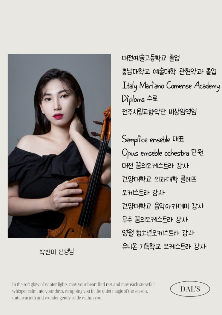 안녕하세요 달스음악학원입니다^^ 많은 학부모님들께서 문의주시고 기다려주셨던 바이올린 레슨을 다시 운영하게 되었습니다!♡ 이번 바이올린 프로그램은 보다 체계적인 커리큘럼과 전문성을 갖추기 위해 풍부한 연주경력과 교육경험을 갖춘 바이올린 전공 선생님을 새롭게 모시게 되었습니다 #대전피아노 #대전음악학원 #달스음악학원 #대전피아노 #둔원초피아노 #백운초피아노 #갈마동피아노 #숭어리샘음악학원 #백운초음악학원 #둔원초피아노 #둔원초음악학원 #경성큰마을음악학원 #갈마동음악학원 #숭어리피아노 #숭어리샘음악학원 #예술융합특강 #갈마동피아노 #탄방동피아노 #경성큰마을피아노 #갈마동바이올린 #둔산동바이올린 #탄방....... <img src="https://blogthumb.pstatic.net/MjAyNTEyMDRfMTU5/MDAxNzY0ODUxNjcwOTU5.7LeUReVpOUrfqSGdgqUsogyaHf6hAyg4EGBYf8AeOhAg.9CGh2e9jBzo58vuOEua3MtJ6FuCG68Ecf_jwMgSTd9Qg.JPEG/IMG%A3%DF8823.JPG?type=s3" />