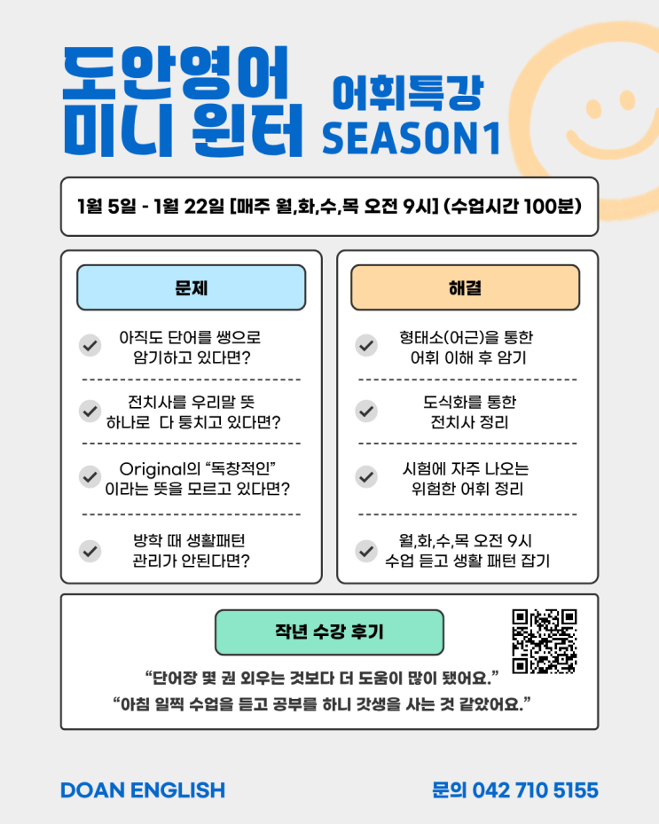 안녕하세요? 도안영어전문학원입니다. 2관에서도 특강이 준비되어 있습니다. 어휘를 외우는게 아니라 근본을 배우는 수업입니다. 지난 학생들이 많이 만족한 강의인 만큼, 소중한 겨울방학! 알찬 시간 만들어보고 싶은 친구들에게 적극 추천입니다. 많이 참여해주세요^^ <img src="https://blogthumb.pstatic.net/MjAyNTEyMDVfMTQz/MDAxNzY0OTMyMjU4ODYx.GfmHhe5alYDzJhR6AY3dXZyHqHAD0kQSGHDUeCWirXog.NbAFaa4ilKyX6Z-3Gd7caL14oBOSGoH1CMorEPhce5Mg.PNG/IMG_8673.png?type=s3" />