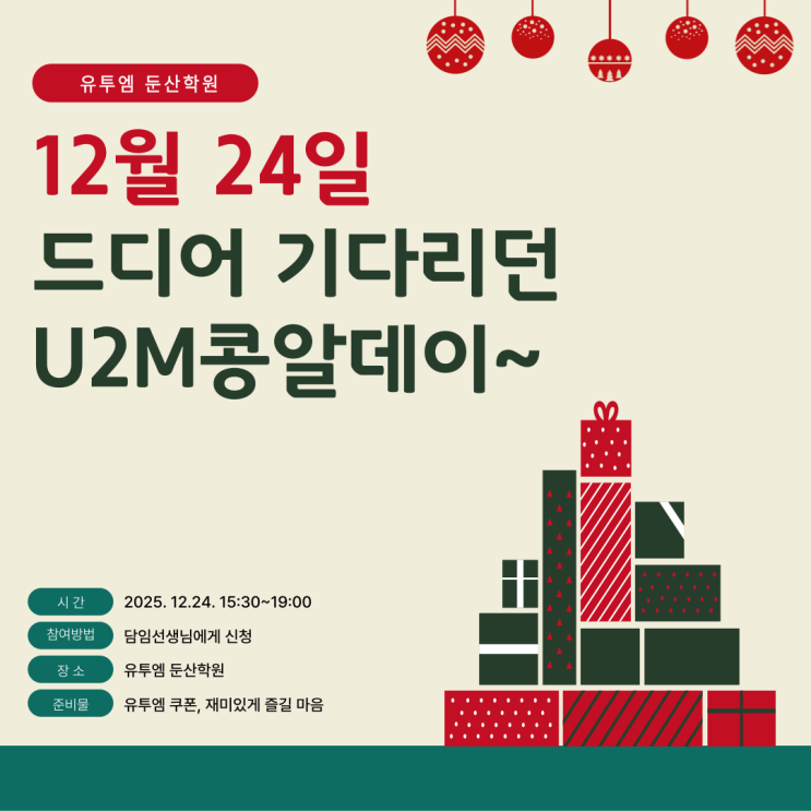 안녕하세요. 유투엠 둔산학원장입니다 이제 2025년도 얼마 남지 않았네요. 한 해 동안 꾸준히 달려온 우리 아이들을 위해 12월 24일(수), 유투엠 콩알데이를 준비했습니다. “선생님~ 저희 콩알데이 언제 해요? 콩알데이 안 해요?” 그동안 콩알데이 언제 하냐는 질문 정~말 많이 받았는데요. 아기다리 고기다리 던 콩알데이가 드디어 열립니다~ 올해 2월에는 애슐리에서 진행했지만 이번 콩알데이는 학원에서 진행하게 되었습니다. 22년 12월 1일은 유투엠 둔산학원 첫 수업을 오픈한 날입니다. 어느덧 3년 차 학원이 되었네요. 감사의 마음 가득 담아 아이들을 위해 정성껏 준비하도록 하겠습니다. ✨콩알데이는 유투엠에서 ✔ 성실하게 공....... <img src="https://blogthumb.pstatic.net/MjAyNTEyMDRfMjQy/MDAxNzY0ODMzMjMzMDk2.AUPAPNHpHg6dUtNaOt6K93tySmsvWdJG682k7ogXTTwg.d4px0JXoKeTJYa6IXxiX9_4y3jVPzIJhF7DrObzjQlMg.PNG/12_24%C4%E1%BE%CB%B5%A5%C0%CC-001.png?type=s3" />