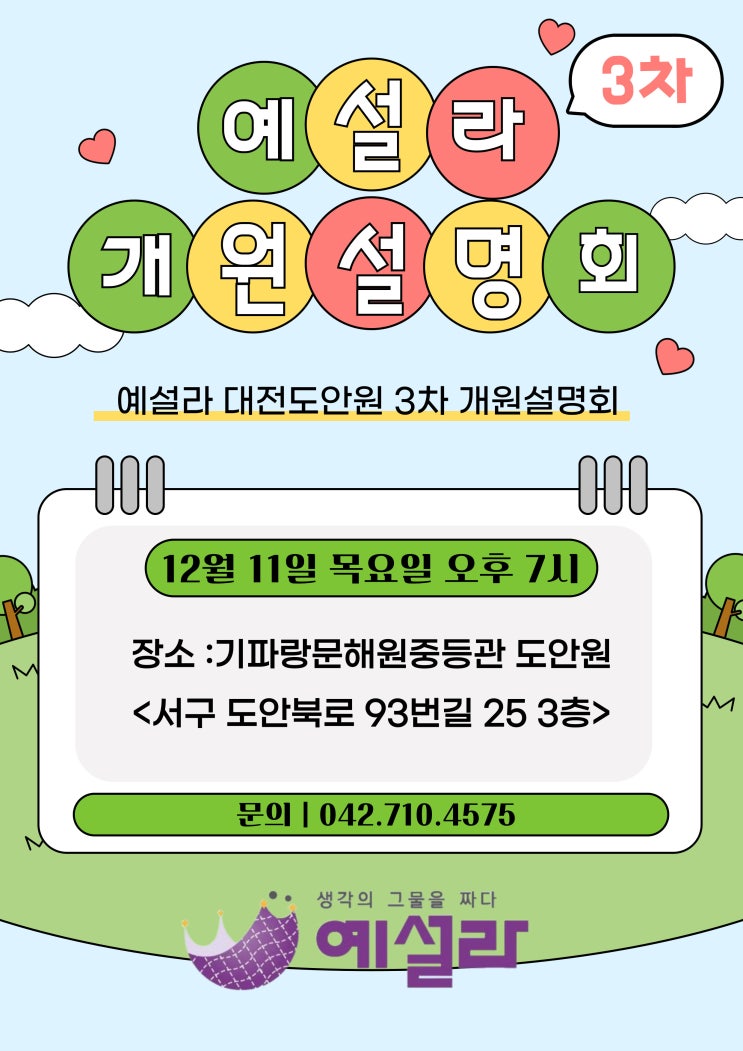 지난 1차, 2차 설명회가 마감되어 3차 설명회를 추가 진행하게 되었습니다. ※ 예설라 대전 도안학원 개원 설명회 일정 ◎ 12월 11일 목요일 오후 7시 장소: 기파랑문해원중등관 도안원 -서구 도안북로 93번길 25 3층 설명회 신청 링크입니다. ↓↓ https://doan.yesolla.com/new_prog/briefing_view.aspx?menu_idx=11960&Hd_B_IDX=1942 ☎ 문의 예설라도안학원 : 042) 710 -4575 기파랑문해원도안원 : 042) 826 -4575 기파랑문해원중등관 : 042) 826-4573 감사합니다 :) #대전 #대전예설라 #예설라도안 #도안학원 #국어학원 #대전국어학원 #예설라 #예설라도안학원 <img src="https://blogthumb.pstatic.net/MjAyNTEyMDZfMjQy/MDAxNzY0OTgwMjY5NDc0.oj5GG70c11lql1YNF4lUm1foN2zEL7k0HCClNhB5Y1sg.8YqZ_M2wp1f5ghh1hL-vvQC4g5gyvFGHFUk8D5kBjkog.JPEG/KakaoTalk_20251206_091721401.jpg?type=s3" />