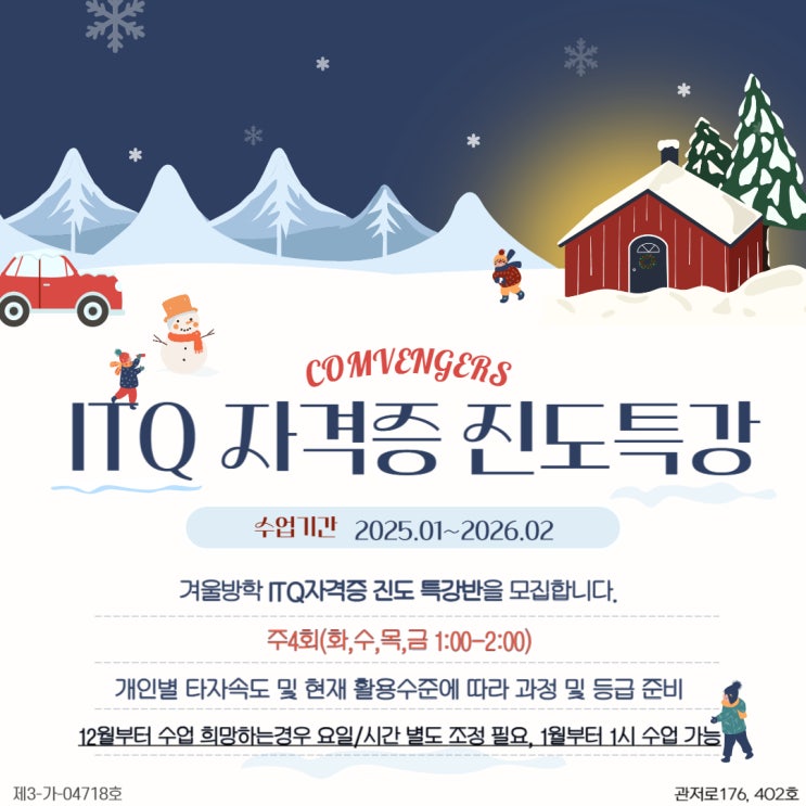 관저동 컴퓨터교육, 컴벤져스 컴퓨터교습소입니다. 겨울방학 모집 시작합니다. 개설 확정된 반 우선으로 순차적으로 시간표/일정 공개됩니다. 학기중에는 시간이 없던 친구들! 방학 2달간 집중적으로 배우고 싶은 친구들! 본인에게 맞는 수업으로 알찬 겨울방학 만들어보세요^-^ 특강 v1. ITQ자격증 진도 특강반 화,수,목,금 1시-2시(주4회) 자격증 시험 대비, 기능 진도 수업 개인별 타자속도, 현재 활용능력에 따라 성취도가 다르지만 기본 타자 150타 이상이고 합격만이 목표라면 (C등급 200~299점/500점 만점) 특강수업(최소 6주)만으로 충분하며 3월 시험 도전이 가능할 수 있습니다. -차후 재시험으로 등급 업 가능- A등급이 목표라면 (A등....... <img src="https://blogthumb.pstatic.net/MjAyNTExMjVfMjYg/MDAxNzY0MDY4MDIyNTk5.3Zqc0kauMQ8qFjqRWBAbSlvoHxCkiIx4wUUYKpVjcKIg.c7rVm8xhDdjAKMyXI-IsKH08zwmHkopVnmY-NjR8Stog.JPEG/%BE%C8%B3%BB%B9%AE-001_%281%29.jpg?type=s3" />