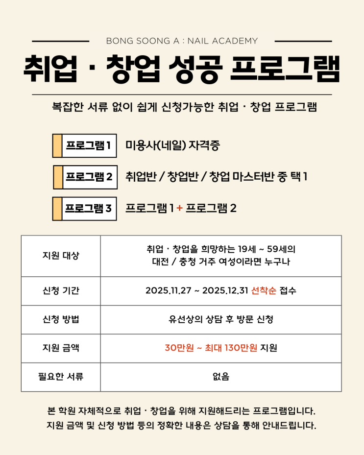 ✨️BONG SOONG A : NAIL ACADEMY 봉숭아가 예비 네일리스트 분들을 위해 [ 취업•창업 성공 프로그램 ]을 준비했어요:D 복잡한 서류없이 쉽게 신청 가능하며, 네일아트 샵으로 취업 또는 창업을 희망하시는 19세 ~ 59세의 대전/충청에 거주하시는 여성이라면 누구나 신청 가능합니다 지원 금액은 ✨️ 30만원에서 최대 130만원까지!!!!!! ✨️ 금액은 수강 과정별로 다르게 지원되니 자세한 내용은 봉숭아로 문의주세요☺️ ──────────────────✧ 대전 봉숭아 네일전문학원 ෆ 네일 전문 강사진 ෆ 네일아트 국가자격증 합격 보장 ෆ 네일 대회 전문학원 ෆ 경력자 재교육 ෆ 국가자격증 / 실무 / 창업 / 드릴....... <img src="https://blogthumb.pstatic.net/MjAyNTEyMDJfMjcg/MDAxNzY0NjYyOTU0MzY4.Lro2-Bx2LzWy86gW7E34jwmuOzRuMUUSRDJEVd0t8wwg.8in0jGgWBOhAw4Sw_jLSPDG3xt9mqeo8F-kOb9X42JAg.PNG/bong_soong_a__nail_academy_%281%29.png?type=s3" />