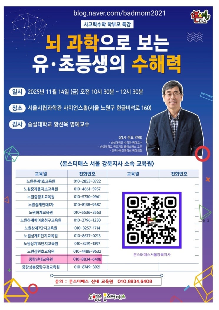 안녕하세요 몬스터매스 퐁당샘입니다 오늘까지 사립초 입학 접수일이였는데요 저희 원에 다니는 친구들도 여러명 등록을 했더라구요^^ 우리 아이들의 좋은 소식 기다리며 저도 좋은 소식 하나 소개합니다♡♡ https://m.blog.naver.com/badmom2021/223655304398 몬스터매스 강북지사에서 작년에 이어 올해도 사고력수학 세미나가 열리게 되었습니다 내용은 뇌과학으로 보는 우리 아이의 수학력! 입니다 “우리 아이, 수학 머리가 없는 걸까?” “아니면 아직 뇌가 준비되지 않은 걸까?” 아이의 ‘수해력(數解力)’— 즉, 수학을 이해하고 문제를 해결하는 힘은 단순히 공부량의 문제가 아니예요 그보다 훨씬 근본적인 ‘뇌의 발달 단계’와....... <img src="https://blogthumb.pstatic.net/MjAyNTExMTJfMjcw/MDAxNzYyOTQ2MDc4MTA0.LPFTBwLyYbiB0SII1idFjSdfyZFgJZe7nkrwpAPcqZcg.Wq_pGPs7AE2Tkle0Zq834dIqcA-A6qh2P2mXhDPzSK4g.JPEG/900%A3%DF1762945942355.jpg?type=s3" />