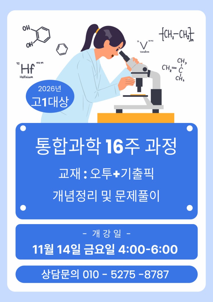 안녕하세요 일등공신 학원입니다 현재 중학교 3학년들은 졸업을 앞두고 설레는 마음 한편으로는 고등학교에 대해서 걱정할 시기입니다. 특히 중학교 시절과 달리 난이도가 확 높아지는 고등과학에 두려움을 많이 느낍니다. 고등학교의 첫 단추를 잘 꿰맬수있도록 일등공신은 현 중학교 3학년을 위한 통합과학 16주 과정을 오픈했습니다. 중학교 과학 vs 고등과학 가장 큰 차이는 깊이와 연결성이에요. 중학교 과학이 각 단원별로 흥미로운 사실을 배우는데 가깝다면 통합과학에서는 확장된 개념들이 어떻게 연결되는지 집중해야합니다. 즉, 단순히 암기만으로 해결할수없죠. 실제로 많은 고등과학 문제들이 논리적인 사고력을 요구하고 있습니다....... <img src="https://blogthumb.pstatic.net/MjAyNTExMTdfMTY0/MDAxNzYzMzY3MzM4MjY3.zT-tQK27Y4gRtq0F6oqv8zslk19bZd3zhWILbawbx1Ug.GyfI4gLvCveHY_bU-uIIIhbwS4Sd-B1EXxgWrZAIEOkg.JPEG/%3F%86%B5%3F%95%A9%EA%B3%BC%ED%95%99_%3F%98%88%EB%B9%84%EA%B3%A01_-001_%282%29.jpg?type=s3" />