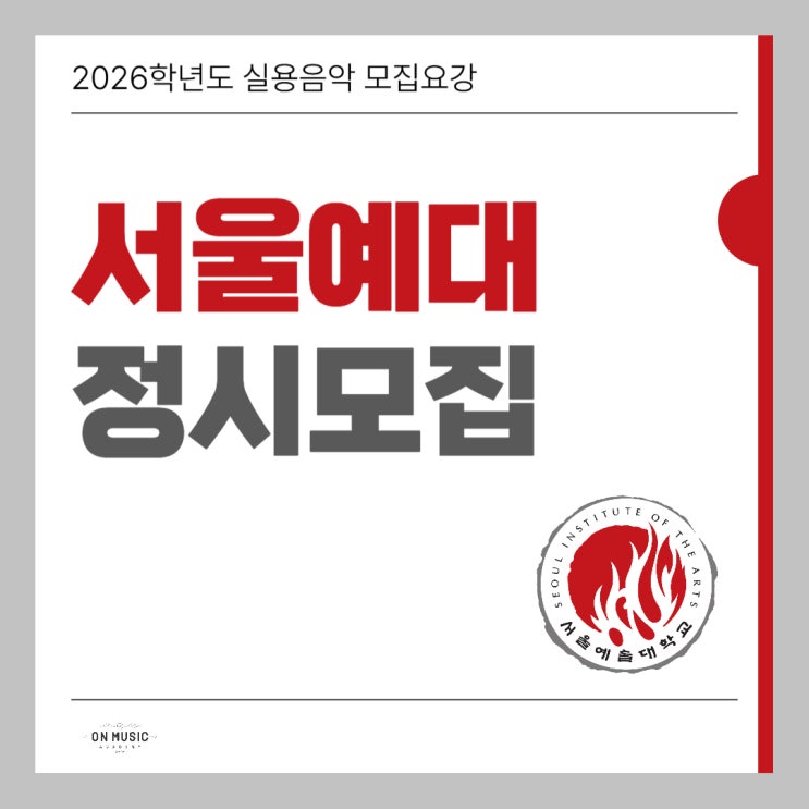 안녕하세요 온뮤직 실용음악학원 중랑캠입니다~^^ 오늘은 서울예대 실용음악과 정시 모집요강을 알아보겠습니다! 전형일정 원서접수 2025. 12. 29.(월) 10:00 ~ 2026. 1. 14.(수) 18:30 수험번호 확인 및 출력 2026. 1. 15.(목) 16:00 개인별 실기고사 일정 공지 2026. 1. 18.(일) 16:00 실기고사 실시 2026. 1. 20.(화) ~ 1.31.(토) 합격자 발표 2026. 2. 2.(월) 16:00 합격자 등록 2026. 2. 3.(화) 10:00 ~ 2. 5.(목) 16:00 모집전공 및 모집인원 < 정원 내 일반전형 > 노래 : 2(남), 2(여) 작곡 : 3 드럼 : 3 베이스 : 3 기타 : 3 피아노 : 4 관악 및 그 외 : 1 전자음악/음향디자인/DJ : 2 < 정원 외 특별전형 > 전문대졸이상 : ....... <img src="https://blogthumb.pstatic.net/MjAyNTEyMDhfNTMg/MDAxNzY1MTc3ODg2Mjg2.uprpbbqoT0H4-3WfAzdUuSacu04WSbo38arsdXmkG3Eg.1dqadlLKgCF1f0KXe-iO4ywf_hZK3xOtcAFK8_ALHP0g.JPEG/001.jpg?type=s3" />