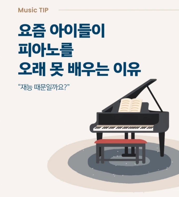 안녕하세요~ 피아노리 음악학원입니다^^ 요즘 많은 부모님들이 " 우리 아이는 피아노 재능이 없는 것 같아요" 라고 말씀하십니다. 하지만 아이들이 피아노를 어려워하는 이유는 대부분 재능이 아니라 속도입니다. 곡을 빨리 완성해야하고 진도를 빨리 나가야하고 연습도 빠르게 늘어야한다는 압박속에서 아이들은 음악을 즐기기보다 버거움을 먼저 느끼게 됩니다. 음악은 결과보다 경험의 교육입니다. 한곡을 완성하는 시간 속에서 아이들은 집중하고 , 기다리고, 끝까지 해보는 힘을 배웁니다. 그래서 좋은 음악교육의 목표는 잘 치는 아이가 아니라 음악을 오래 사랑하는 아이를 만드는 것입니다. 아이의 속도를 조금만 기다려 주....... <img src="https://blogthumb.pstatic.net/MjAyNjAzMjNfMTQ2/MDAxNzc0MjU2NTUyMzUz.-duEJxBrwESc6qv2hSZZjBVQdSt2K6wKUAXjt305TRwg.lvVrl4mhv9at4NZoVGitjVsC-cmp5qFcxJai2p660Nkg.JPEG/900%A3%DFBandPhoto%A3%DF2026%A3%DF03%A3%DF23%A3%DF18%A3%DF01%A3%DF46%A3%DF1.jpg?type=s3" />