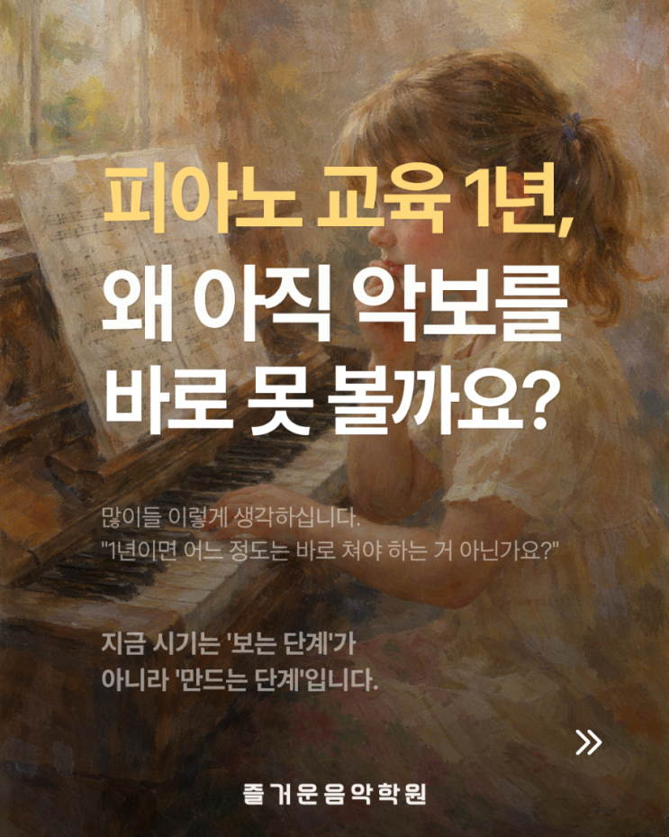 벌써 우리 아이들이 새 학년 새 학기를 시작한 지 한 달이 다가오네요~~그 사이 쌀쌀하던 날씨가 제법 봄 날씨를 갖춰가고 있네요. 요즘 상담을 하다 보면 부모님들께서 저에게 질문을 하시는데 다른 부모님들도 궁금해하시는 부분일 거 같아서 신내동 음악학원 즐거운음악학원 유원장이 답해드릴게요. “왜 아직도 악보를 보고 바로 못 칠까요?” 피아노 1년 차 아이를 둔 부모님께 드리는 이야기 피아노를 배운 지 1년 정도가 되면 많은 부모님들이 한 번쯤 이런 생각을 하게 됩니다. «“이 정도 했으면 악보 보고 바로 칠 수 있어야 하는 거 아닌가요?”» 하지만 이 질문에는 조금 다른 시선이 필요합니다. --- 피아노 연주는 ‘읽....... <img src="https://blogthumb.pstatic.net/MjAyNjAzMjNfMTgg/MDAxNzc0MjcyNTQ1NDYw.hxJ7f8edn-nrq0Kl6bc0OGRJy9QkLfgCP48NZfqMhuog.GjgNnXvxxm6xVr2C3c7PWkVrGAtZwtAFFfFFvAqO1wog.PNG/900%A3%DF1774228854513.png?type=s3" />