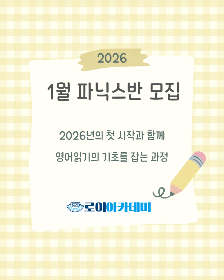 " 첫 시작으로 추후 영어 실력의 정도가 결정됩니다." 2026년의 첫 시작을 더욱 힘차게 열기 위해 1월 초 신학기 파닉스반을 새롭게 편성합니다. 영어를 처음 시작하는 아이들에게 가장 중요한 것은 단단한 기초입니다. 그 기초의 핵심이 바로 파닉스(Phonics)예요. 파닉스과정의 의미 알파벳소리에서 단어읽기 문장읽기의 과정을 이어주는 첫 시작! 스스로 읽을 수 있는 토대를 마련 정확한 발음으로 읽으며 듣기와 말하기의 기초 정립 이후 원서읽기까지 학습 속도가 빨라짐 로이아카데미 파닉스반의 특징 ▶ 체계적인 파닉스 커리큘럼 음가 → 단모음 → 장모음 → 이중모음까지 아이 수준에 맞춘 단계별 과정으로 정확한 읽기 실력....... <img src="https://blogthumb.pstatic.net/MjAyNTEyMDFfMTQ4/MDAxNzY0NTU3NTE1NjA5.pwD5lRS92VGcUAtpV2WyT1iOOyx9pyAGVRb4j5A6Cf4g.SfNveH3-8fXU4HfnmPLWvWlYbPaZokd5gsSul4p-Jsog.PNG/%B3%EB%B6%F5%BB%F6_%C8%F2%BB%F6_%B1%CD%BF%A9%BF%EE_%C3%BC%C5%A9%B9%AB%B4%CC_%B8%DE%B8%F0_%B0%F8%C1%F6_%BE%C8%B3%BB_%C0%CE%BD%BA%C5%B8%B1%D7%B7%A5_%C6%F7%BD%BA%C6%AE.png?type=s3" />