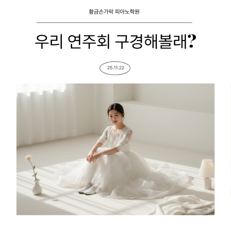 2025.11.22.(토) 오후 4시 – Music in Us 연주회 황금손가락 피아노학원 우리 황금손가락 피아노학원 친구들이 따뜻한 박수 속에서 멋진 무대를 만들어 주었어요 ✨ 이번 연주회에는 보람초 4학년 오○호, 대평초 5학년 권○회, 보람초 6학년 박○연 학생이 참여하여 그동안 열심히 준비한 곡을 자신 있게 선보였습니다. 무대에 오르기 전에는 설렘과 긴장으로 두 손을 꼭 쥔 모습이었지만, 조명이 켜지는 순간 누구보다 멋진 연주자로 변신! 연주가 끝난 뒤에는 친구들과 함께 인증샷도 남기며 스스로에 대한 뿌듯함과 성취감을 가득 안고 내려왔답니다 아이들의 성장은 늘 음악 속에서 반짝입니다. 황금손가락 피아노학원은 앞....... <img src="https://blogthumb.pstatic.net/MjAyNTEyMDRfMTYx/MDAxNzY0ODE3NDc4NzI1.BGMnZjoXuc7mbDIFdv6JJq4QEY2RHSJVoat3w5KyOasg.GYnApmBof5RhdH7X3dFVoN3Q8F6_twdZ15Bq6iEx1Ecg.PNG/900%A3%DF1764816842439.png?type=s3" />