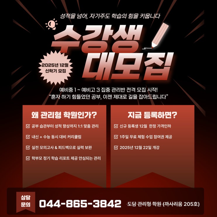 2025년 12월 22일 도담 관리형 학원 오픈 예정 신규 등록시 다양한 혜택을 제공하오니 많은 관심 부탁드립니다! 교육문의 044) 865-3842, 010-2781-7650 <img src="https://blogthumb.pstatic.net/MjAyNTEyMTBfMTU3/MDAxNzY1MzY2OTYzMTQ3.uvWWW0F57fKlQdajp82h38B8qwTjuYTGgJGSPSfuHhgg.wPFJaoeCaljMkZQ1StomWs5eSxXBlIalTBbyL7-3DgAg.JPEG/%B1%A4%B0%ED_%C6%F7%BD%BA%C5%CD.jpg?type=s3" />
