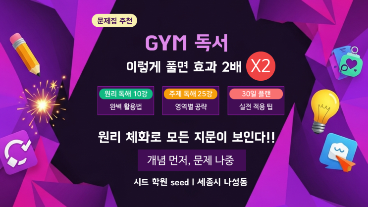 안녕하세요. 세종시 나성동에 위치한 '시드 학원'입니다. 고등학교 내신과 수능을 중점으로 국어와 영어를 가르치는 학원입니다. 지난 포스팅에 이어 [이투스북] 독서(비문학) 문제집 분석 시리즈 6번째를 시작합니다. 이투스북에서 출판한 비문학 문제집 중 GYM 독서, 일이삼 독서, 수평선 독서를 집중적으로 분석하고 있습니다. 6번째 문제집 추천 주제는 'GYM 독서(비문학), 어떻게 활용하는 것이 좋을까?'입니다. GYM 독서, 그냥 풀기만 하면 절반만 얻습니다. 이 문제집은 "어떻게 활용하느냐"에 따라 효과가 2배 이상 차이납니다. 오늘은 GYM 독서를 제대로 활용하는 구체적인 방법을 공개합니다. GYM 독서....... <img src="https://blogthumb.pstatic.net/MjAyNjAxMTZfMjY0/MDAxNzY4NTQwNDQxOTMx.-LTx4kjWLcU7y_KivBPoLpf_HXXBKDaV_UEAAkpdA1Qg.Kgn9G075yFKAtA7Ghrr8rtcigZaahSUurGu3UqDtL-og.PNG/%B1%B9%BE%EE_%B9%AE%C1%A6%C1%FD_%C3%DF%C3%B5_%C0%CC%C5%F5%BD%BA%BA%CF_GYM_%B5%B6%BC%AD_%C0%CC%B7%B8%B0%D4_%C7%AE%B8%E9_%C8%BF%B0%FA_2%B9%E8_%BC%BC%C1%BE%BD%C3_%B3%AA%BC%BA%B5%B5_%B1%B9%BE%EE_%C7%D0%BF%F8_%BD%C3%B5%E5.png?type=s3" />