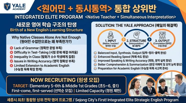 예일어학원에서 새로운 영어 프로그램이 출범합니다. 예일어학원이 오랜 분석과 설계 끝에 완성한 <원어민 + 동시통역>으로 이루어진 <통합 상위반> 입니다. 이 수업은 단순한 신규 개설이 아닙니다. 영어 학습 구조 자체를 재설계한 전략 프로그램입니다. 우리는 먼저 냉정하게 분석했습니다. 원어민 수업만으로는 왜 상위권 완성이 어려운가. 원어민 수업을 오랫동안 진행을 한 뒤 발견한 한계점들은 아래와 같습니다. 1. 노출은 늘어나지만 정확한 문법 정리가 부족합니다. 2. 문법 및 독해 등의 문제를 접했을 때, 오답을 찾는 경우가 많다는 것입니다. 3. 발화가 일부 적극적인 학생에게 집중된 현상이 있습니다. 4. 유창성은 있....... <img src="https://blogthumb.pstatic.net/MjAyNjAyMjdfMjIz/MDAxNzcyMTg0NzM1ODUw.2kEGhqxndRVU5i9mPkJZlFTLkDn_-lnaBL8Q2ElS-tgg.RFJ0zBmypWo3TkE0EFK7DAPhH6QMWcapUJJ0HsGy7t8g.PNG/Gemini_Generated_Image_33m7ya33m7ya33m7.png?type=s3" />