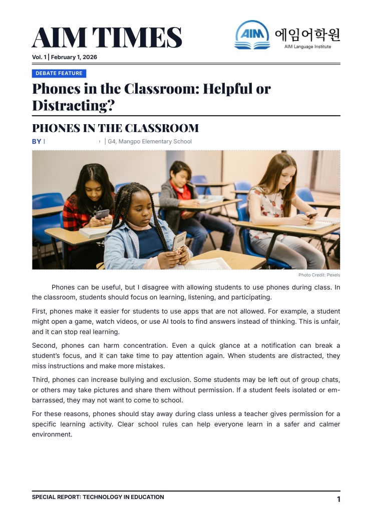 안녕하세요, 에임어학원입니다. 2025년 3학기(9–12월) 동안 진행된 AIM TIMES 영자신문 만들기 프로젝트가 완성되어 제1호를 출간하게 되었습니다. 이번 프로젝트는 Leader 레벨과 Advanced 레벨 학생들의 기사를 모아, 한 권의 신문 형태로 편집 및 제작했습니다. 프로젝트 진행 방식 학원에서는 학생들이 작성할 기사 분야를 큰 틀에서 제시하고, 각 카테고리 안에서 학생들이 주제를 직접 조사, 선정하여 기사로 작성하는 과정을 진행했습니다. 기사 카테고리는 아래와 같이 구성되었습니다. 사회 / 교육 / 토론 / 엔터테인먼트 / 문화 / 게임 / 환경 / 인물 기사 완성 과정(작성 → 첨삭 → 재작성) 모든 기사는 작성 후 첨삭과 재작성 과정....... <img src="https://blogthumb.pstatic.net/MjAyNjAyMDZfMTg0/MDAxNzcwMzA1NjQ3Mzkx.htsmcvCba3CokmhRCEI15HC5FiWRY0zcI8wiLtSaSMAg._QObn-PQ3LTnLbgBVNyh1y2-gag4N4lW-DDW37wOyfcg.JPEG/AIM_Times_-_Vol._1_%28Table_of_Contents_Updated%29_page-0001.jpg?type=s3" />