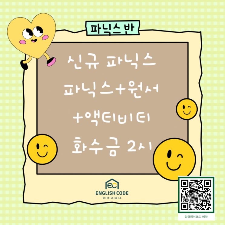 안녕하세요. 잉글리쉬코드입니다. 매년 새해가 되면 새해 계획을 세우는데 우리 친구들은 모두 새해 계획을 세우셨을까요? 운동을 해서 멋진 몸매를 갖는다던가 새로운 취미 생활을 시작하기도 하지요. 새해 계획에서 매번 빠지지 않는 것이 바로 영어 정복이지요. 혹시 올해 계획에 "영어 1등급 받기"를 목표로 한 친구들은 그에 따라 여러 가지 계획도 세우고 좋은 수업도 찾고 계실 거예요. 잉글리쉬코드에서는 영어 정복을 노리는 친구들과 함께 올 한 해 열심히 달려보려고 해요. 파닉스 반부터 고등부까지 올해부터 새로운 시작을 해 나갈 친구들은 아래 상담 예약을 해 주세요. 파닉스반 화수금 또는 월화금 2시(주3회) 파....... <img src="https://blogthumb.pstatic.net/MjAyNjAyMDZfMjYg/MDAxNzcwMzc3NjgyMjE5.YZieUXug1CP9xy6JzSbWKo9z-nH0JQQyzkAX4rcsi-sg.hqgEbH2MF3f6RQzKDqkolZnB2-WOGc4YC6En9oUUDDwg.PNG/%B3%EB%B6%FB_%B1%F2%B2%FB%C7%D1_%C3%BC%C5%A9_%C6%D0%C5%CF_%C0%AF%C4%A1%BF%F8_%BE%EE%B8%B0%C0%CC%C1%FD_%BE%CB%B8%B2%C0%E5_%C0%CE%BD%BA%C5%B8%B1%D7%B7%A5_%C6%F7%BD%BA%C6%AE_%A3%AD_5.png?type=s3" />