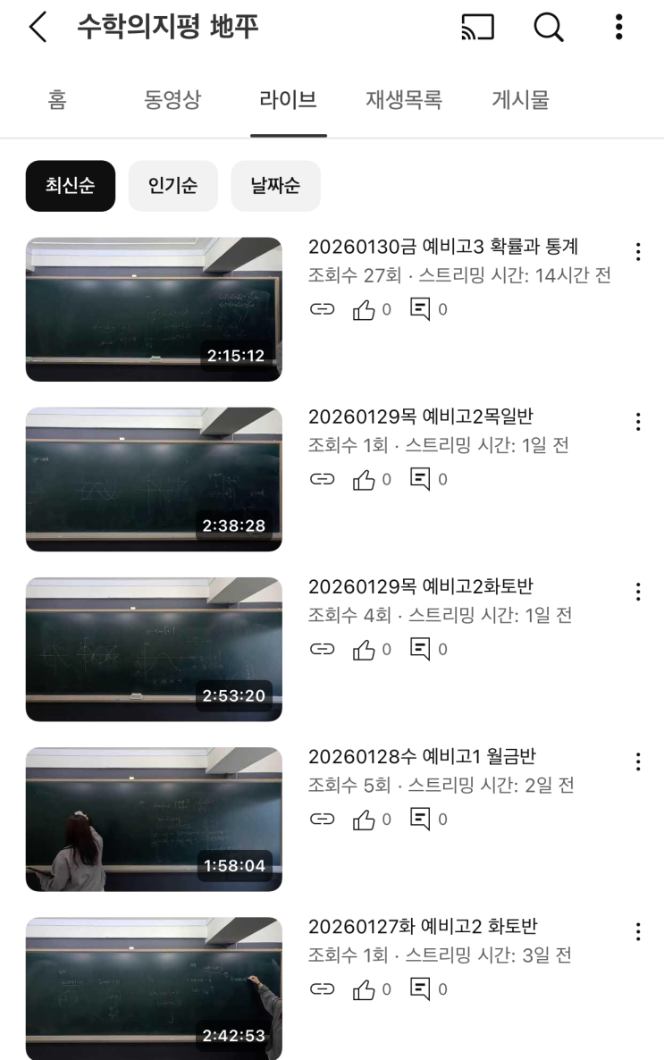 앞으로 모든 수업은 유튜브 라이브로 송출될 예정입니다. 스트리밍 영상 링크는 수업별 단톡방에 공유됩니다. 링크를 받은 학생은 실시간으로 시청 가능하며, 수업 종료 후에는 녹화 영상이 업로드 됩니다. 불가피하게 학원에 등원할 수 없는 경우 또는 수업을 수강하였더라도 복습이 필요한 경우에 활용하면 좋을 듯 합니다. * 결석 시 보강은 해당 영상으로 대체됩니다. (수업 내용 관련 질의 응답이 필요한 경우 별도 보강 일정 조율) <img src="https://blogthumb.pstatic.net/MjAyNjAxMzFfMTg4/MDAxNzY5ODI0NDE5OTc1.8xa8NwK-Bb9TWGCCbevFU0aJfrzIyJaqhcSTamcABiAg.U0RlUFzVwXIH_gt3SDAhD5s8IT5v-RZvdfwpQ1YbLEMg.PNG/KakaoTalk_20260131_100104392.png?type=s3" />