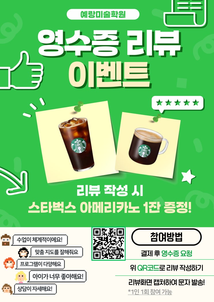안녕하세요 성북구 미술학원 / 유아미술 / 초등미술 전문 예랑미술학원입니다. 예랑미술학원은 아이들이 즐겁게 그림을 배우며 창의력과 표현력을 키울 수 있도록 체계적인 미술교육을 진행하고 있습니다 학부모님들께서 보내주시는 소중한 후기와 응원 덕분에 아이들이 더욱 즐겁게 성장하고 있어 감사한 마음을 담아 ✨ 영수증 리뷰 이벤트 ✨ 를 준비했습니다! 수업 후 느끼신 점이나 아이의 변화, 만족하셨던 부분을 리뷰로 남겨주시면 작은 감사 선물을 드립니다 ☕ 이벤트 내용 리뷰 작성 시 스타벅스 아메리카노 1잔 증정! 참여 방법 1️⃣ 결제 후 영수증 요청 2️⃣ QR코드 스캔 후 리뷰 작성 3️⃣ 작성한 리....... <img src="https://blogthumb.pstatic.net/MjAyNjAyMDhfMjA2/MDAxNzcwNTUxNDYyNTM3.8gNHpzX8l3dCVeRqTzxA_o9wG-Z-4iv2KGUtpn98B2cg.hKFBb49UhmEbgs0jOuhzPdhLRed3jgBM24s0X3Z3-Rwg.JPEG/%B8%AE%BA%E4%C0%CC%BA%A5%C6%AE_%BC%F6%C1%A4.jpg?type=s3" />