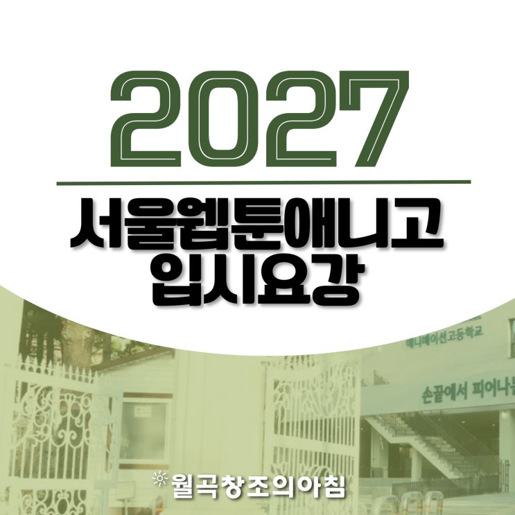 안녕하세요. 월곡창조의아침 미술학원입니다. 오늘은 서울웹툰애니고, 서웹고 입시요강을 들고 왔습니다. 서웹고는 생긴 지 3년 밖에 안된 학교로 서울에 애니고가 생겨서 많은 관심을 받고 있는 학교입니다. 남태령역에 위치해있고 서웹고 창설 아래 월곡창조의아침은 꾸준히 합격생을 보내고 있습니다. 지원자격 서울웹툰애니고는 중학교 졸업예정자 중학교 졸업과 동등학력 인정자는 지원 가능합니다. 모집인원 서울웹툰애니고는 웹툰애니메이션계열, 게임콘텐츠과가 있습니다. 2가지 과 중에 선택할 수 있는데 웹툰애니메이션계열은 4학급으로 80명 정도 모집하고 있습니다. 서웹고는 학과마다 미래인재전형, SWAS 인재전형 2가지 전형이 있....... <img src="https://blogthumb.pstatic.net/MjAyNjAyMTBfMTgw/MDAxNzcwNzExODI4NTc1.i3LjeYTExrHQTq7LCSovGzD6_Gjj4E4jGk2OTYNuGCgg.vTP2Um7j_6L0dyHEtEz6gBJFV2ZWJxKAsXWyjPTi2CMg.JPEG/2027_%BC%AD%BF%EF%C0%A5%C5%F7%BE%D6%B4%CF%B0%ED_%C0%D4%BD%C3%BF%E4%B0%AD_%282%29.jpg?type=s3" />
