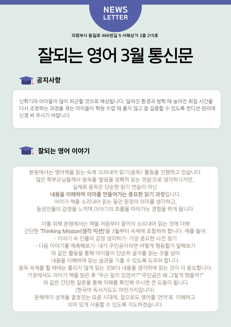 원서를 소리내어 읽는 숙제를 할 때, 기계적으로 읽고 뜻은 생각하지 않는 학생들이 있습니다. 이유는 여러 가지가 있겠지만, 의미 있는 읽기와 문해력 향상을 위해 사고력을 강제할 수 있는 포인트 미션을 추가하게 되었습니다. 과제 끝내기만을 목표로 하는 자동 읽기 모드가 아닌 생각하며 읽기 모드를 위해서는 이해 중심의 읽기가 되어야 하기에, 가장 중요한 문장 줄 치기, 세 단어로 요약하기, 나라면 어떻게 할지 써보기 등 매번 다른 미션이 과제로 나갑니다. 평생 가는 영어는 초등학교 때 결정됩니다. 그 중요성을 알기에, 오직 초등학생만 사명감으로 연구하고, 사명감으로 가르칩니다. <img src="https://blogthumb.pstatic.net/MjAyNjAyMjhfMTA0/MDAxNzcyMjU3MzI4MTY5.gZ_8P3IiRURKG1iEztiZmYfA3HWY8SpT80KdktQghWAg.6HmnzxY9mECb-aRjudqU4WenzdjZBQQ_1rMr0PmOP9cg.PNG/3%BF%F9.png?type=s3" />