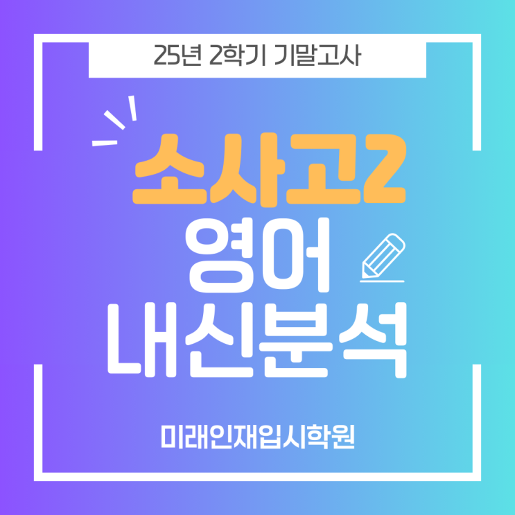 소사고2 영어 내신 분석 1. 시험 범위 교과서 : 6과 / 모의고사 : 15개 2. 영역 분석 3. 문항 분석 4. 소사고 2학년 영어 시험 특징 학습한 텍스트를 기반으로 약 25% 내외의 변형이 이루어졌으며, 출제 범위는 시험 범위 전반에 걸쳐 비교적 고르게 분포되어 출제되었습니다. 이번 시험의 가장 두드러진 특징은 선택형 문항의 모든 선택지가 영어로 제시되었다는 점입니다. 단순한 정답 암기가 아닌, 지문 내용을 정확히 이해한 상태에서 선택지를 분석해낼 수 있는 능력이 점수 차이를 만드는 핵심 변수로 작용했습니다. 논술형 문항의 경우, 주어진 텍스트를 읽고 제시된 어휘를 활용하여 문장을 배열해 영작하는 순서배열형 영작 문제로 출제....... <img src="https://blogthumb.pstatic.net/MjAyNjAxMTFfNzUg/MDAxNzY4MTI3MDUwNjgz.7TUmaEk4MWPXWQoOCBdYRwSBUrBWoZrAaKWnVNmMg8Ug.hn7_-cN-YmGBppKpDUUU1FTwWds30VGIZqiOPxD1hnUg.PNG/%B3%EC%BB%F6_%B8%F0%B4%F8%C7%D1_%BA%ED%B7%CE%B1%D7_%BC%B6%B3%D7%C0%CF_%C0%CE%BD%BA%C5%B8%B1%D7%B7%A5_%B0%D4%BD%C3%B9%B0_%287%29.png?type=s3" />