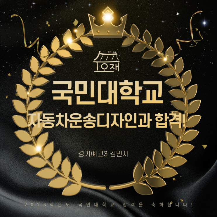 안녕하세요, 부천 수오재 국어학원입니다! 오늘은 우리 수오재 경기예고 학생들 중 또 하나의 빛나는 합격소식을 전해드립니다. 바로 경기예고 3학년 김민서 학생의 국민대학교 자동자운송디자인학과 정시 합격 소식입니다! 국민대학교는 디자인 계열에서 최상위권 학교이며 자동차운송디자인학과역시 높은 경쟁률을 보여주고 있습니다. 실기는 당연히 잘해야하고 수학반영 비중이 아주 적은 디자인학과 특성 상 국어 성적 반영 비율이 높아 내신 국어는 물론 수능 국어 준비도 잘 해야하는데요, 민서 학생은 1학년 때부터 수오재 국어학원과 함께하며 80점대 후반의 높은 국어 성적을 유지해 왔습니다. 수능 역시 무리없이 잘 해주었고 실기와 공....... <img src="https://blogthumb.pstatic.net/MjAyNjAyMTFfMjY3/MDAxNzcwNzg3NzY5MDA3.1wCpsEdq818mNPKZxrqAJ4T2nZtbtwDtCzNbq0Eo8Y0g.kawucxagT29QzfYkCXcN8019hWL5cisvu_DBbvV4fsYg.PNG/%C1%A6%B8%F1%C0%BB_%C0%D4%B7%C2%C7%D8%C1%D6%BC%BC%BF%E4._%288%29.png?type=s3" />
