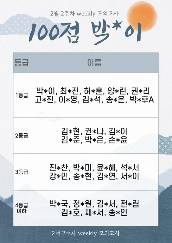 안녕하세요. 레벨미업 학원입니다. 26년 2월 2주차 영어 weekly 주말 모의고사 시험 결과입니다 (2/9 ~ 2/10) 진행 모의고사 : 23년 고1 6월 모의고사 월/화 오후 4시 30분 진행 일정 확인하고 꼭 등원하여 시험 진행하기를 바랍니다!! <img src="https://blogthumb.pstatic.net/MjAyNjAyMTBfODQg/MDAxNzcwNzIxNzQyNTE3.cHVJ2uLUzbi5ftNeORJ9rRnEkyaEqOtHTFcEDBoNE3Ug.e0j5wQr0As0WD4qHd9hX-chOnd_qxIvYfyTqZUB0I_Ig.PNG/image.png?type=s3" />