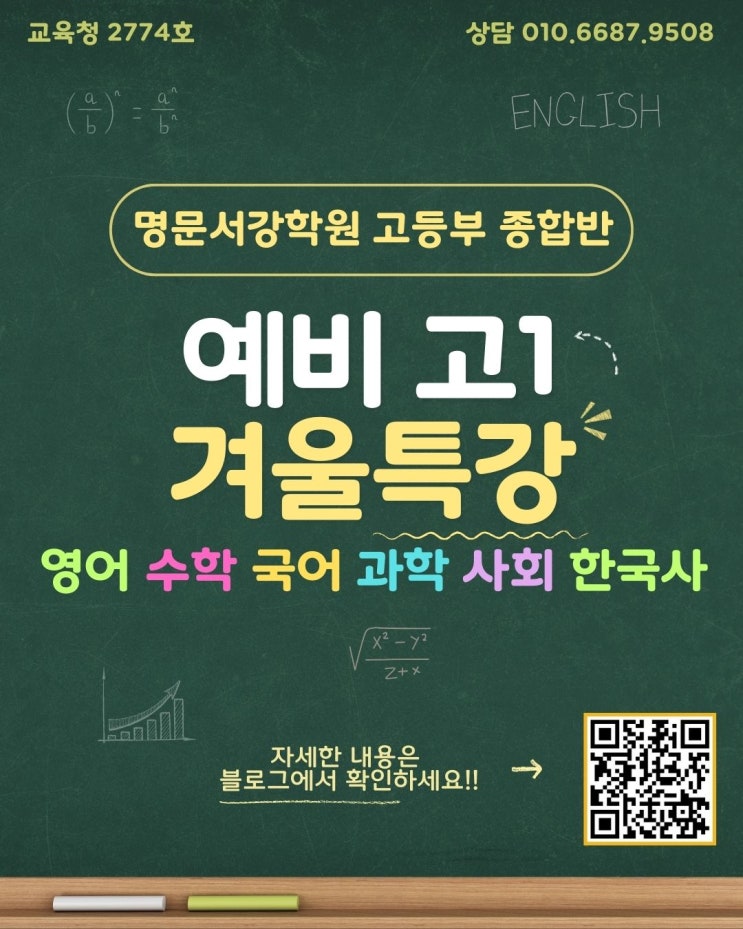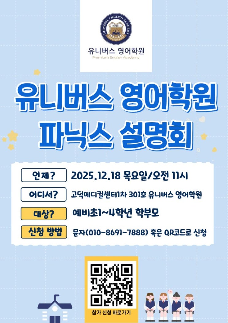 유니버스 영어학원 설명회 안내 안녕하세요 확장 이전한 유니버스 영어학원에서 새 학기 파닉스 프로그램 소개를 위한 설명회를 진행합니다! 일시: 2025년 12월 18일(목) 오전11시 장소: 유니버스 영어학원 본관 대상: 예비초1~현 4학년 학부모님 내용: 커리큘럼 안내 · 무료 레벨테스트 ✔ 문자 혹은 QR코드로 참가 신청서 작성해주세요 ✔ QR코드 링크: ✔ 문의: 010-8691-7888 많은 관심과 참여 부탁드립니다! ✨ <img src="https://blogthumb.pstatic.net/MjAyNTEyMDFfMTI2/MDAxNzY0NTcwMjMwODc3.l65LhoLBH_Wz2IfUWStjxtPGIsQT3trkp7Rt3Vb6PpYg.Rh4xi2VTQAv-NVtkoI2d04U8InikWoA-70ut8-rJL5wg.JPEG/2.jpg?type=s3" />