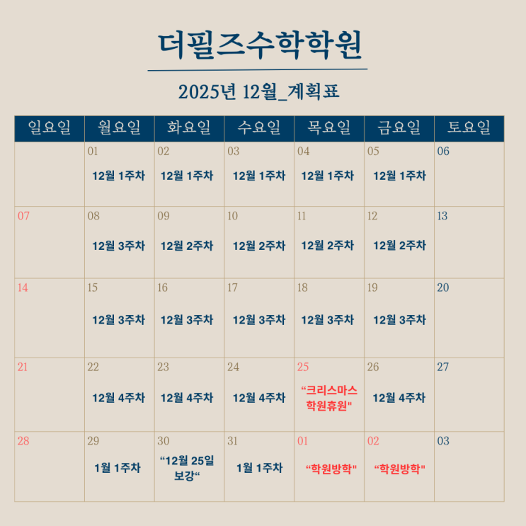문의전화 : 010-5023-7923 ⭐️더필즈 수학학원 12월 학사일정안내 ⭐️ 안녕하세요. 어머니 ^^ ❤️매월 마지막주는 다음달(12월) 학습 등록기간입니다.❤️ -카드결제링크 원하시는 분은 말씀해주세요~ -입금 진행을 원하시면, 이체 후 꼭 알려주세요~ (아이 이름으로 입금부탁드릴게요.) (1002-832-490275 우리은행 허승연) ⭐️ 12월 휴뮤일 있음⭐️ 12월25일 크리스마스 학원 휴무 12월 30일(화요일) 보강 진행합니다. ♥ 저희 더필즈수학학원은 한달 = 4주(12회)에 맞춰 수업합니다~^^ ♥ 수업일정을 꼭! 확인해주세요. *여행이나 일정이 있으실때는 수업 일주일전-최소4일전까지 미리 말씀해주시면 보강수업을 잡아드립....... <img src="https://blogthumb.pstatic.net/MjAyNTExMjZfMTQ5/MDAxNzY0MTIzNzA2MzM1.64OlUh5OYGl1HNqtXR5H4-0qgjcJtVF972C7-K1tTmIg.thHZxE3_Vaam1IX19C3QI0tUd2Vo_YqmotsovGodBQgg.PNG/12%BF%F9%BD%C3%B0%A3%C7%A5.png?type=s3" />