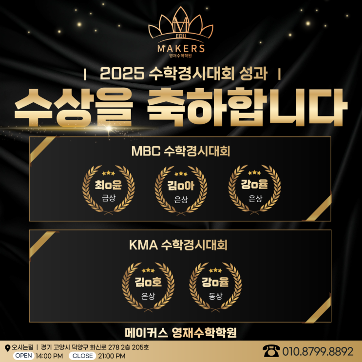 2025 수학경시대회 성과 결과 안내 2025 수학경시대회에서 메이커스 학생들이 또 한 번 뛰어난 성과를 만들어냈습니다! 체계적인 커리큘럼과 단계별 심화 학습, 그리고 학생 개개인에 맞춘 맞춤 지도 속에서 다수의 수상자가 배출되는 값진 결과를 거두었습니다. 수상을 진심으로 축하하며, 앞으로도 학생들이 더 큰 목표에 도전할 수 있도록 끝까지 함께하겠습니다. 성대경시·KMA·MBC 대비 | 2월 초등 경시반 개강 예정 이오니 참여 희망하시는 분은 별도 문의 바랍니다. <img src="https://blogthumb.pstatic.net/MjAyNjAxMDVfMTE5/MDAxNzY3NTg1NTIxMDY5.ZXA-8bUrLpoj22y_vLG_qzQH7rf4J6Y8JHJwxxvg5Lcg.0c43jo3AwkIzQ2JMzMvwBJ8ztJhvGFqnakAgQcLTJvog.PNG/2025_%BC%F6%C7%D0%B0%E6%BD%C3_%BC%BA%B0%FA-001_%281%29.png?type=s3" />