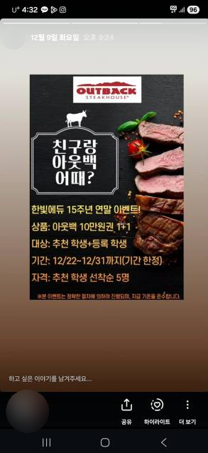 안녕하세요, 라이트 영어입니다. 오늘은 작년 12월에 진행했던 한빛에듀 15주년 기념 이벤트인 친구추천 1+1 이벤트 후기를 들려드리려고 합니다! 여러분들의 진심어린 애정과 관심 덕분에 성황리에 아웃백 이벤트를 마쳤습니다!! 앞서 공지했던 것처럼 재원생이 친구를 소개해서 등록하게 된다면 1+1 이벤트로 두 친구 모두에게 10만원 상당의 아웃백 상품권이 지급되었습니다! 또한 저희 학원 이벤트를 인스타로 홍보해준 학생들에게는 베스킨 라빈스 싱글콘 키프티콘을 선물했습니다! 이렇게 인스타에 공유를 해주면 인증샷 받자마자 바로! 기프티콘을 선물 했습니다!! 그리고 대망의 아웃백 상품권은!!! 이벤트 접수 기간 종료 후 모두 실물....... <img src="https://blogthumb.pstatic.net/MjAyNjAyMTlfMTEz/MDAxNzcxNDMwMzIxMTMy.IUrzhCtxs4HM2_nWfdFXx0Mjg1XStwfwH-Ii9lZ364cg.mt5msuoidvZqHFlIgfZ6qt7-7vUkx218Ih8Ok_E8pCIg.PNG/%C0%CE%BD%BA%C5%B8.png?type=s3" />