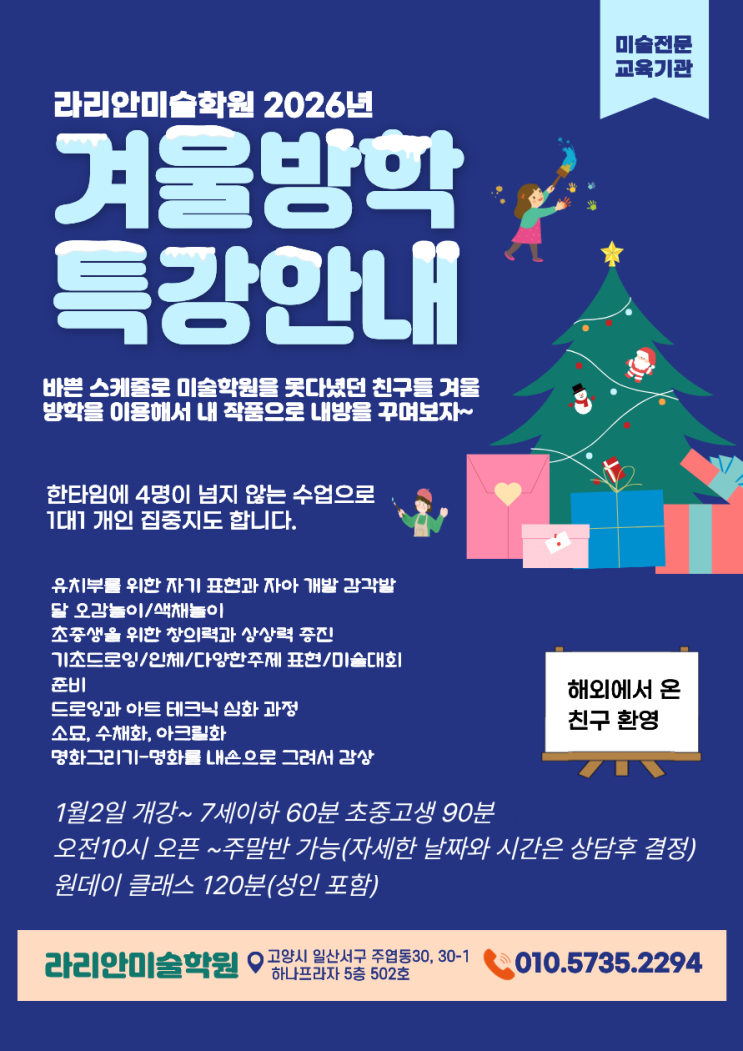Hello CDI Students! You're invited to our CDI Christmas Celebration! 열심히 공부한 일산청담친구들!!! 청담어학원에서 준비한 크리스마스 파티에 초대합니다~ 12월 24일 (수) - 12월 26일(금) 에는 크리스마스 이벤트들이 준비되어 있어요. Are you ready~~~ EVENT 1. Who will win the Holiday Project? 청담 산타가 크리마스 프로젝트의 위너에게는 작은 선물을 준비했어요~ EVENT 2. CHRISTMAS MARKET is coming to CDI 그동안 열심히 공부하여 청담 달러 많이 모았을까요?? 열심히 모은 달러를 flex 해보아요~~ 다음 주 청담에서 만나요:) <img src="https://phinf.pstatic.net/image.nmv/blog_2025_12_20_96/1qKAsArmly_01.jpg?type=f480x480" />