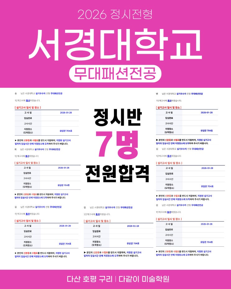 2026 서경대학교 정시 합격 소식! 2026 다같이 미술학원 수시합격 소식을 전해드리겠습니다! 서경대학교 무대패션전공 실기 100% 1차 정시반 7명 전원 합격! 수시전형 1차 13명 합격에 이어, 조형실기반 정시반 7명 학생이 전원 1차에 합격 했습니다. 1차 합격을 진심으로 축하드립니다. 최종 합격까지 끝까지 응원하겠습니다! <img src="https://blogthumb.pstatic.net/MjAyNjAxMjhfMjQ3/MDAxNzY5NTk2NDMzMjkx.7pybYSheDpbYED1V_zUN9Cp6iQuMgPTfa-1Xzzxhc_gg.-AB1kntSE6IZjPPRYmazEZi_ZdQfBTO3AqdQ6uncwdwg.JPEG/KakaoTalk_20260128_184326249.jpg?type=s3" />