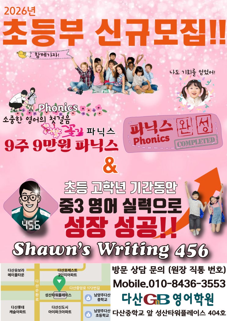 안녕하세요! 다산지앤비(GnB) (초등) & Shawn's English with Parallax (중등) 영어 학원의 원장 Shawn입니다! 남양주 다산동에는 파닉스를 가르치는 영어학원은 많습니다. 하지만 파닉스부터 초등 고학년, 그리고 중등 내신까지 하나의 흐름으로 이어지는 학원은 많지 않습니다. 영어의 시작, ‘제대로 된 파닉스’ 영어는 소리를 모르고는 절대 읽을 수 없습니다. 그래서 파닉스는 빠르게 끝내는 과정이 아니라 앞으로의 모든 영어 학습을 떠받치는 기초 공사입니다. 저희 학원에서는 ✔ 알파벳 암기식 파닉스 ❌ ✔ 무작정 읽히는 파닉스 ❌ 소리–철자–읽기–쓰기까지 연결되는 파닉스로 아이가 혼자서도 단어를 읽고, 쓰고, 이해....... <img src="https://blogthumb.pstatic.net/MjAyNjAyMDVfMTA1/MDAxNzcwMjY1MjI4NTI1.hBlUsOBpKlFtEhCPBK9YC13V2JuLt85L3awl0yTkLY4g.PTXqM7VWddjVf8F5qBSHe0iC5LI-aY1pJO0Y1Umneb4g.JPEG/2026_%EC%B4%88%EB%93%B1%EB%B6%3F_%3F%8B%A0%EA%B7%9C%EB%AA%A8%EC%A7%3F.jpg?type=s3" />