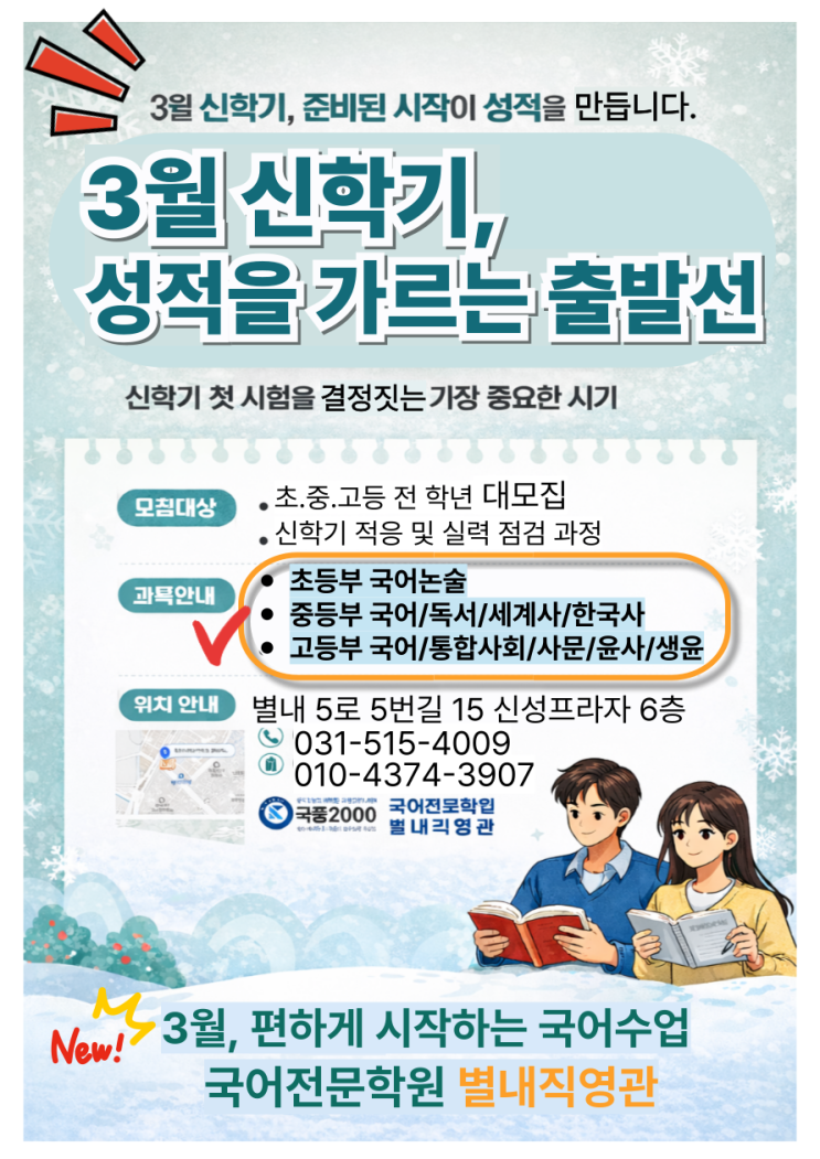 안녕하세요. 성적향상의 바이블! 수능·내신·학종의 삼위일체 학습법 국풍2000 별내직영관입니다. 3월 신학기, 국어 성적의 방향이 결정되는 시기입니다. 국풍2000 별내직영관은 신학기 적응과 실력 점검에 집중합니다. 3월 신학기, 국어 성적의 방향을 잡아야 할 때입니다 신학기가 시작되는 3월은 아이의 국어 공부 방향이 정해지는 시기입니다. 이 시기를 어떻게 보내느냐에 따라 국어는 물론, 다른 과목까지 학습 흐름이 달라집니다. 국어는 초반 방향이 가장 중요합니다 국어는 단기간에 성과가 나타나는 과목이 아닙니다. 지문을 읽고 이해하는 힘, 개념을 정확히 연결하는 사고력이 시간을 두고 차곡차곡 쌓여야 합니다. 그래서 신학기 초....... <img src="https://blogthumb.pstatic.net/MjAyNjAyMDdfNjIg/MDAxNzcwNDUwMTU4MDEw.1_AxVdeIFdqj1gOObl1KXq5YxzMY6asjyoykH1DMjskg.cPMp66w-8Dv-birBBUTtY31yNnbVsOQ8SoiZHqbHGxYg.PNG/%BA%B0%B3%BB%B0%FC-001.png?type=s3" />