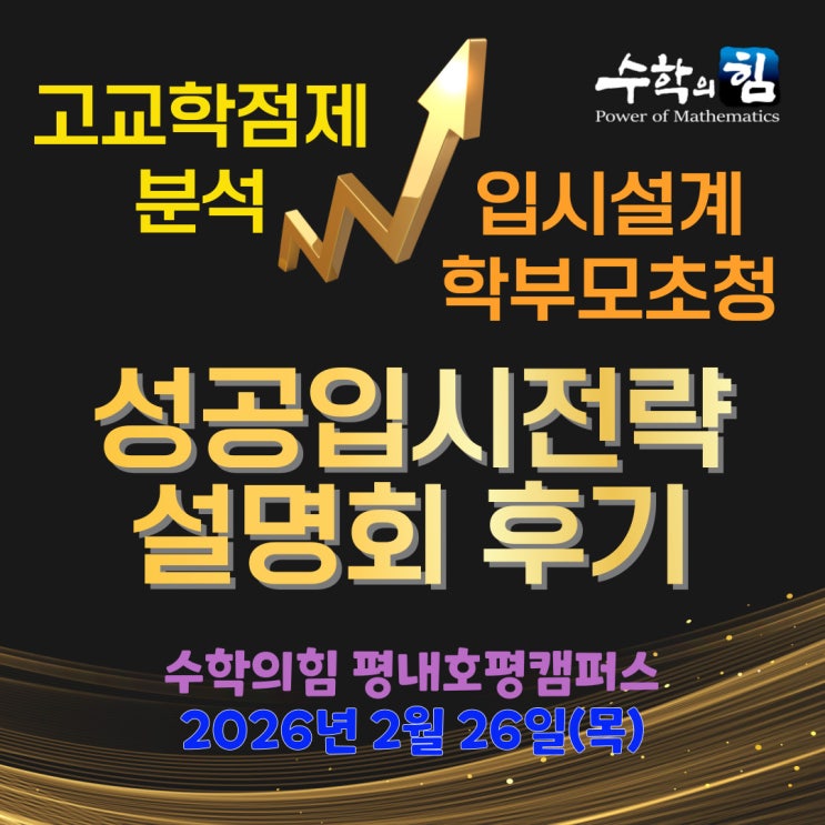 안녕하세요~ 수학의힘 평내호평캠퍼스입니다. 지난 2월 26일 목요일에 수학의힘 평내호평캠퍼스에서는 성공입시전략 고교 학점제 및 입시설계 관련하여 학부모설명회를 진행하였습니다. "지금 우리 아이, 제대로 준비하고 있는 걸까요?" 많은 학부모님들의 고민에서 출발한 이번 성공입시 전략설명회, 그 현장을 공유해드립니다. 설명회는 하루의 행사가 아니라, 오랜 고민과 준비의 결과입니다. 아이 한 명, 한 명을 떠올리며 자료를 준비했습니다. 작은 차이가 결국 큰 결과를 만든다고 믿기 때문입니다. 단순한 설명회가 아닌, 실질적인 도움되는 시간이 되도록 평내호평지역 중학교와 고등학교 분석 대입개편, 고교학점제, 개념교....... <img src="https://blogthumb.pstatic.net/MjAyNjAyMjhfMjE4/MDAxNzcyMjU0MzAyMTMw.rpMTJBPU75tuY-oCNijoc7qp5fJ3yX14JfF6HRrcJzQg.rW5orSrwLD8rW5l8fq_AGhdQDI3UvonenPN7KH5atT0g.JPEG/%C1%A6%B8%F1%C0%BB-%C0%D4%B7%C2%C7%D8%C1%D6%BC%BC%BF%E4__%BA%B9%BB%E7%BA%BB-001_%282%29.jpg?type=s3" />