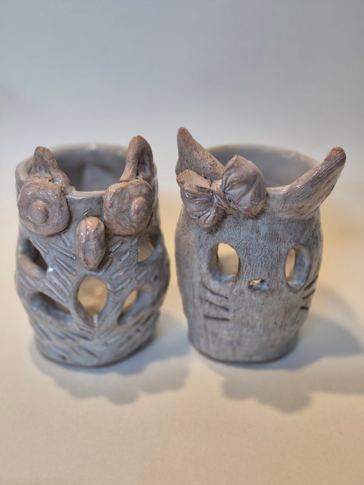 오랜 시간을 끙차 끙차 노력의 노력을 ~~~~~~~~~~다해 만들어 낸 도자기들.. 아이들은 조잘 조잘 수다스럽다가도, .....어느순간 .....고요한 교실이 되어버리는 ....신비한 흙의 힘 ,도예시간.. 고학년들과 유치부의 대결 ㅎㅎ 2026년 금년에는 청자흙의 붉고 탁한 느낌에 백유를 시유하여 빈티지하면서도 멋스러운 투각작품을 만들었습니다. ^^ (청자/산화/ 백유/1230도) 반짝거리고 매끈한 도자기들을 구경하며, 다음번엔 어떻게 만들겠다는 다짐을 하면서 , 다음 도자 계획에 대해 다짐하는 시간을 가지니.... 더욱 만들기에 자신감이 붙는것 같습니다. 위쪽2개의 사진은 은 청자에 화장토를 발라 긁어내는 방법을 사용하여 아이들이 손과 팔....... <img src="https://blogthumb.pstatic.net/MjAyNTEyMTlfNTEg/MDAxNzY2MTE0NTAzMTg5.IUhrDRtrvY9Cxcu1aBlrGmXcO5OumDXWh1zZQFMYBDUg.Ipwv16C28cLQeRvhYC5IGt4OccmI2VUFu5QfFTzxyZIg.JPEG/KakaoTalk_20251210_133755980_04.jpg?type=s3" />