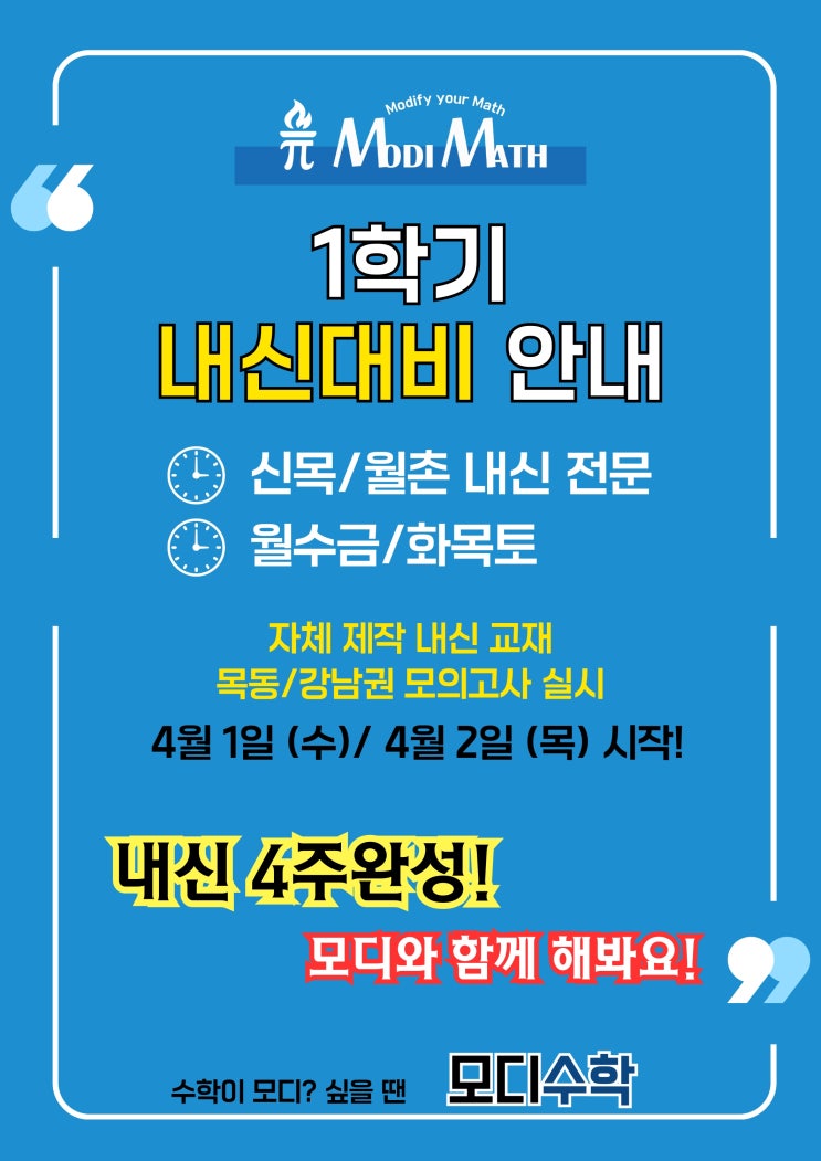 안녕하세요. 모디수학 입니다. 추운 겨울이 지나가고 부쩍 따뜻해진 아침입니다 :) 다가오는 봄과 함께 스리슬쩍 다가오고 있는 중간고사! 시험대비를 모디와 함께 해봐요 :D 아이들의 뒤에서 아이들의 앞을 바라보는 모디수학이 되겠습니다. Modify your Math! 모디수학 입학문의 ☎ 010.9114.2154 #목동수학 #교습소 #목동내신 #중등수학 #고등수학 #심화수학 #신목중 #월촌중 #양정중 #염창중 #영도중 #영도초 #정목초 #경인초 #월촌초 #중간고사 #수학만점 #개별진도 #내신완성 #수학1등급 <img src="https://blogthumb.pstatic.net/MjAyNjAzMjNfMTE1/MDAxNzc0MjU3NjU5MjM4.Xwu2tJweyHURgHzparrErYiQHCDQzLGehiY42mwtYLcg._skIaDe9iWETKbzNv8p2lqNfmYlUgiJjcJb8CvVY9mAg.JPEG/%B8%F0%B5%F0%BC%F6%C7%D0A4%C6%F7%BD%BA%C5%CD_%BC%BC%B7%CE_%28260323%29.jpg?type=s3" />