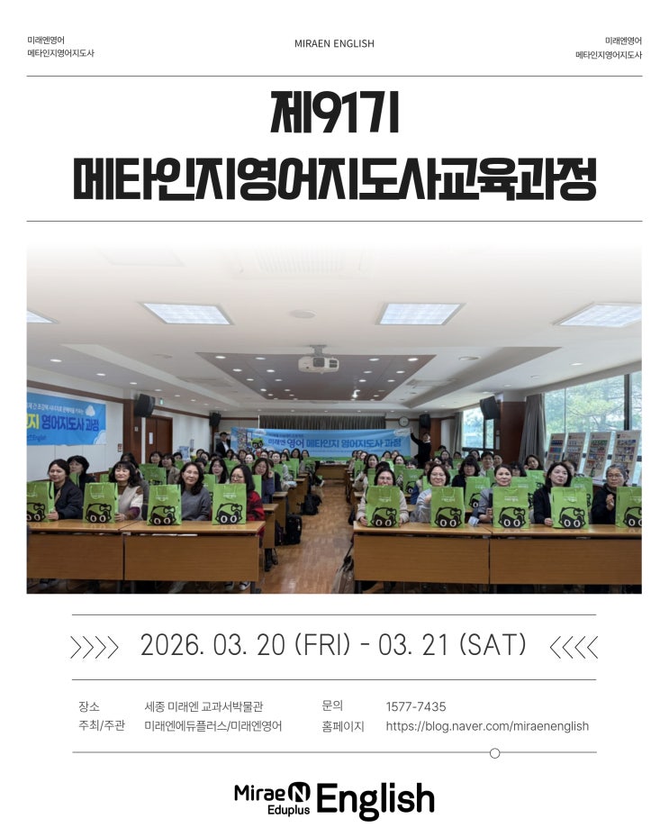 안녕하세요. 미래엔영어입니다. 따뜻한 봄기운이 다가온 2026년 3월, 미래엔영어는 또 한 번 의미 있는 배움의 장을 열었습니다. 현장에서 바로 적용 가능한 실질적인 지도 역량부터 미래엔영어만의 교육 철학까지, 이번 과정은 한 단계 더 성장하는 전환점이 되었습니다. 지금부터 제91기 메타인지 영어지도사 과정의 생생한 현장을 소개해 드리겠습니다. 미래엔 교과서박물관 2026년 3월, 제91기 메타인지 영어지도사 과정은 세종에 위치한 미래엔 교과서 박물관에서 진행되었습니다. 이번 교육은 약 2일간 진행되었으며, 새학기를 맞아 새로운 시작을 준비하는 신입 강사님과 신규 가맹점 원장님들을 대상으로 체계적인 프로그램이 운영되었습....... <img src="https://blogthumb.pstatic.net/MjAyNjAzMjRfMjM5/MDAxNzc0MzQyMjgwNTgy.fRhq268QX3K4W3Iuefy0j56HruFCEdOMnEl6ewhP0n8g.LSPxSHLuPjssVnb8XTkNsrIvLkkARiETr90d0JsxaDEg.JPEG/91%B1%E2_%C7%A5%C1%F6.jpg?type=s3" />