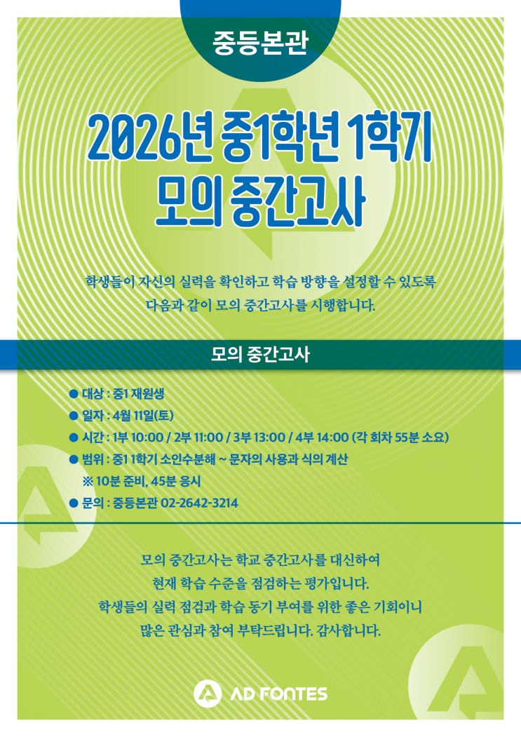 안녕하세요, AD FONTES 학원입니다. 중학교 1학년은 학교 중간고사가 진행되지 않아, 현재 학습 상태를 확인하고 점검할 기회가 상대적으로 부족한 상황입니다. 이에 학생들이 자신의 실력을 점검하고 앞으로의 학습 방향을 올바르게 설정할 수 있도록, 다음과 같이 실전 모의 중간고사를 시행합니다. 모의 중간고사 학교 중간고사를 대신하여 현재 학습 수준을 점검하는 평가입니다. ✔ 대상: 중1 재원생 ✔ 일자: 4월 11일(토) ✔ 시간: 1부 10:00 / 2부 11:00 / 3부 13:00 / 4부 14:00 (각 회차 55분 소요) ✔ 범위: 중1 1학기 소인수분해 ~ 문자의 사용과 식의 계산 ※ 10분 준비, 45분 응시 ✔ 문의: 중등본관 02-2642-....... <img src="https://blogthumb.pstatic.net/MjAyNjAzMjdfMjkw/MDAxNzc0NjE2MjQ1Nzg3.75xEFOLYcMOVqo75ur2FHndtZPglyEZ76JVUmB1nfyog.J6HQMmAZP1l5NgI5so3STb3kJqLCctW2lg4hvdGVvXMg.JPEG/%C1%DF1_1%C7%D0%B1%E2_%B8%F0%C0%C7_%C1%DF%B0%A3%B0%ED%BB%E7.jpg?type=s3" />