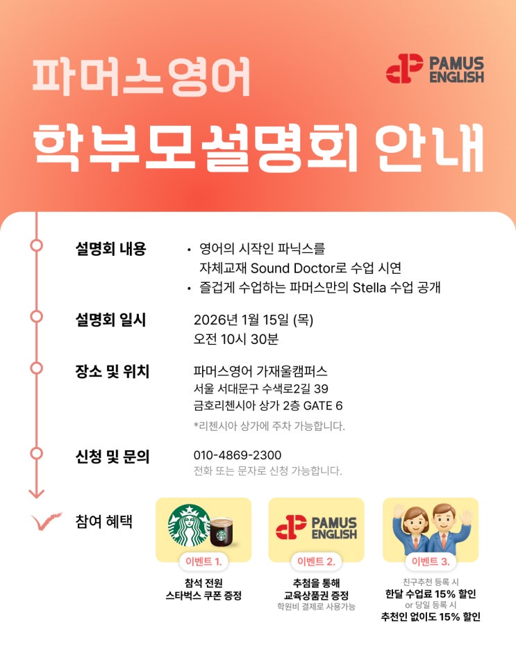 안녕하세요~ 파머스영어 가재울캠퍼스 입니다~ 오늘은 파머스 영어의 커리큘럼에 대해 관심이 많으신 학부모님들께 반가운 소식을 전하려고 합니다. 벌써 한 해를 마무리하는 시기가 왔는데요, 얼마 남지 않은 새 해, 1월 학부모 설명회에 여러분을 초대하려고 합니다~!! 이번 설명회는 초등영어에 관심이 많으신 모든 학부모님들을 대상으로 하는 설명회입니다~ 설명회 일정은 새해 1월15일 목요일!! 오전 10시 30분 부터 오후 12시 30분까지 약 2시간 정도 진행될 예정이며, 추첨으로 드리는 교육상품권과 오시는 모든분들께 드리는 스타벅스 상품권을 꼭 받아가시기 바랍니다~!!^^ 주차 가능합니다~ (3시간 무료) 많은 학부모님들께서 이미 선....... <img src="https://blogthumb.pstatic.net/MjAyNTEyMDJfMjIy/MDAxNzY0NjcwNzQyODI5.SLPBM8KT7tXT8gj-QoB0MwputmJCvjAc7kkcFE9gXeMg.aaliL0qhpZP4wNUSC9tX8aXe0ZDkiLt1kj3yxVrPbO8g.JPEG/20260115%BC%B3%B8%ED%C8%B81.jpg?type=s3" />